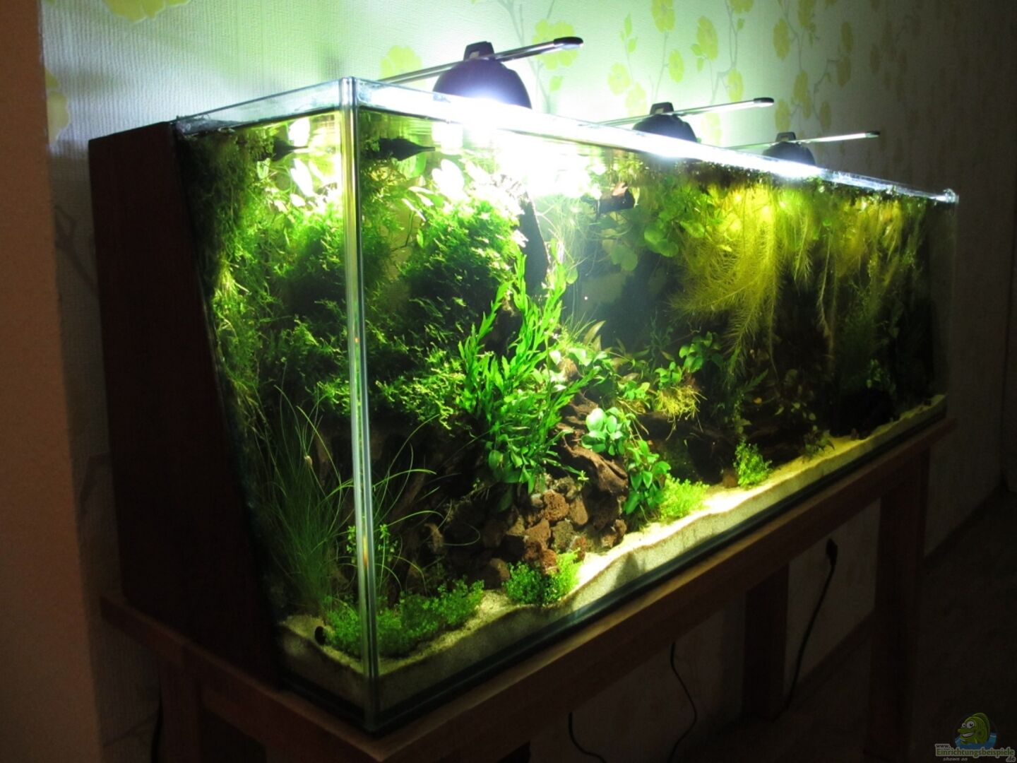 Eingeklebte Terasse aus Plexiglas mit Lavasteinen beklebt. Algenbälle aufgerollt mit Saugnäpfen an der Beckenrückwand befestigt. Holz-Seitenteile, gebeizt als Sichtblende Mangrovenholz an die Rückwand silikoniert und bepflanzt