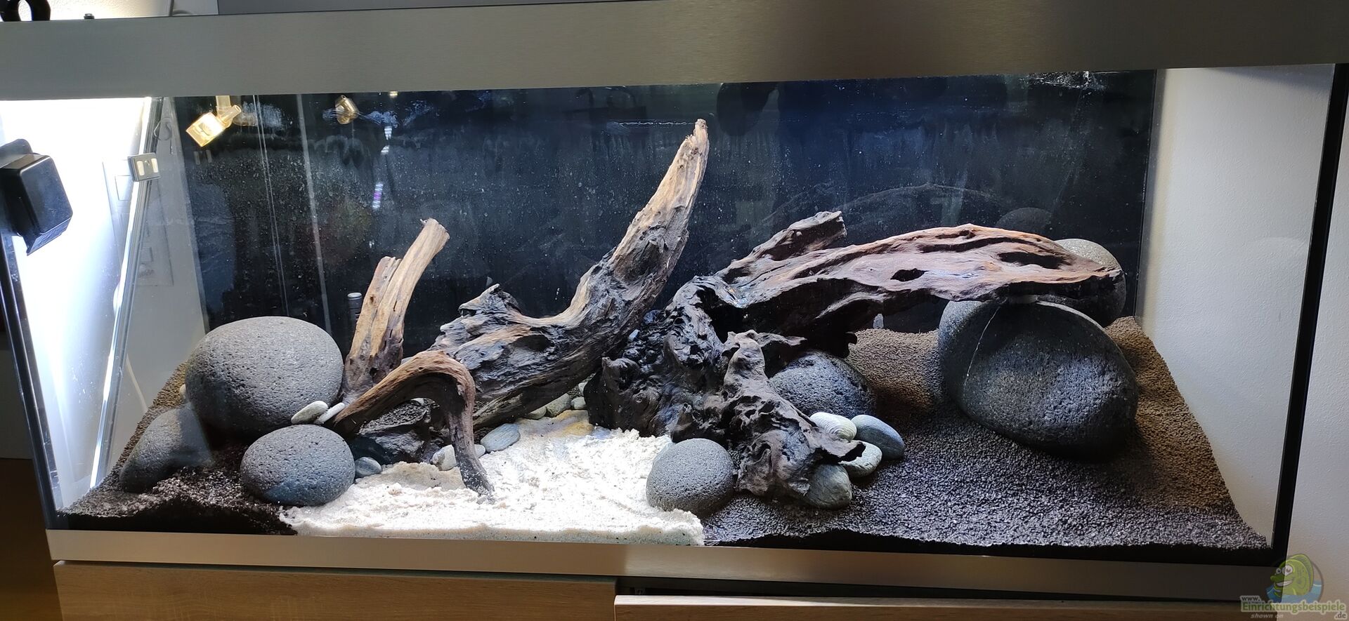 Es sind 3 Stück Mangrovenwurzeln eingebaut. Diese wurde mit dem weiteren Hardscape verklebt. (übrigens inklusive 4 Fingern :-)) Die Vulkansteine liegen durch ihre eigene Schwerkraft an Ort und Stelle. Einige Stellproben erfolgten im Trockenen. Die Wurzeln wurden zwei Wochen lang gewässert. Zwei der drei Wurzeln sind "voll" - bleiben also unter Wasser. Eine Wurzel flotiert auf und wurde mit Sekundengel und Watte nach unten verklebt. Beim Einfahren bilden sich auf der Wurzel Bakterienrasen. [...]