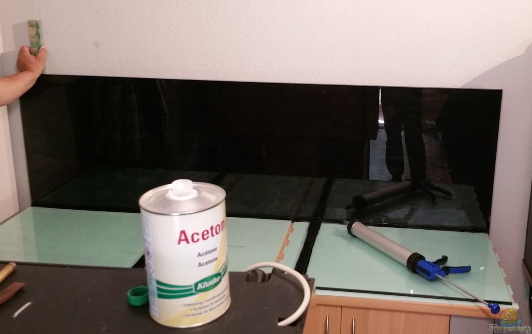 Ich habe mich dazu entschieden das Becken vor Ort von der Firma Aquariumbau Ennigerloh kleben zu lassen. Bilder vom Bau sind unten zu sehen. Die Seitenscheiben, sowie die hintere Scheibe wurden mit schwarzer D-C-Fix Folie beklebt, um im Becken eine entsprechende Tiefe zu erzeugen und damit die Schattenzonen noch mehr zur Geltung kommen. Als Unterschrank dient ein Stahlgestellt, welches komplett mit Holz verkleidet ist (4 Türen) und ebenfalls mit d-c-fix Folie foliert wurde (Buche & [...]