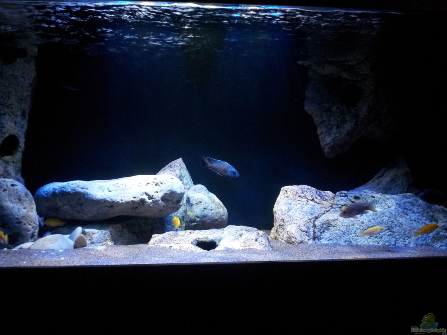 Rechteckaquarium: Das Aquarium hat vorne ein Opti-White Glas. Rückwand und beide Seitenscheiben sind aus Floatglas gefertigt. Glasdicke ist jeweils 12 mm. Längsstreben an Front-und Rückscheibe sowie Bodenstreben an Front- und Rückscheibe. Zusätzlich ein Mittelsteg. Die Rückwand und beide Seitenwände wurden mit schwarzer Farbe gestrichen. Die Farbe lie??e sich durch Seifenwasser und einem scharfen Schaber wieder wie eine Folie abziehen. Im linken hinteren Beckenbereich sind zwei Bodenbohrungen [...]