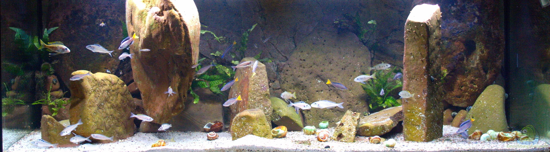 Standardbecken der Firma Aquarienkontor aus Haltern am See - Glasstärke 12 mm, Front- und Seitenscheiben aus Wei??glas - Unterbau aus Aluminiumprofilen mit Scherwänden aus 15mm starken Siebdruckplatten - Eingeklebte Back to nature Slimline Red Gneis Rückwand. Ziel des Projekts war es, steile Felswände (Rückwand und hängende Felsmodule) als Lebensraum für Cyprichromis sowie eine durch stehende Felsen gut gegliederte (Reviergrenzen), sandreiche ??bergangszone nachzubilden, in der sich [...]