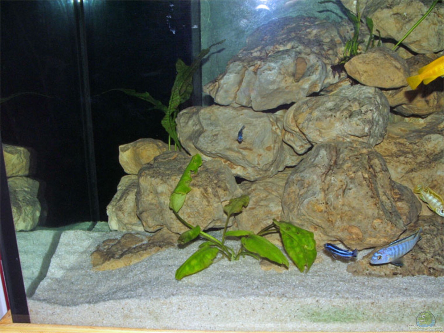 Schwarzer Filterschacht mit Bohrung für Ablauf zum Filterbecken, zweite Bohrung für Rücklauf vom Filterbecken ins Aquarium; Unterschrank Eigenbau (um Alurahmen drumherum gebaut); mit Glasscheiben abgedeckt