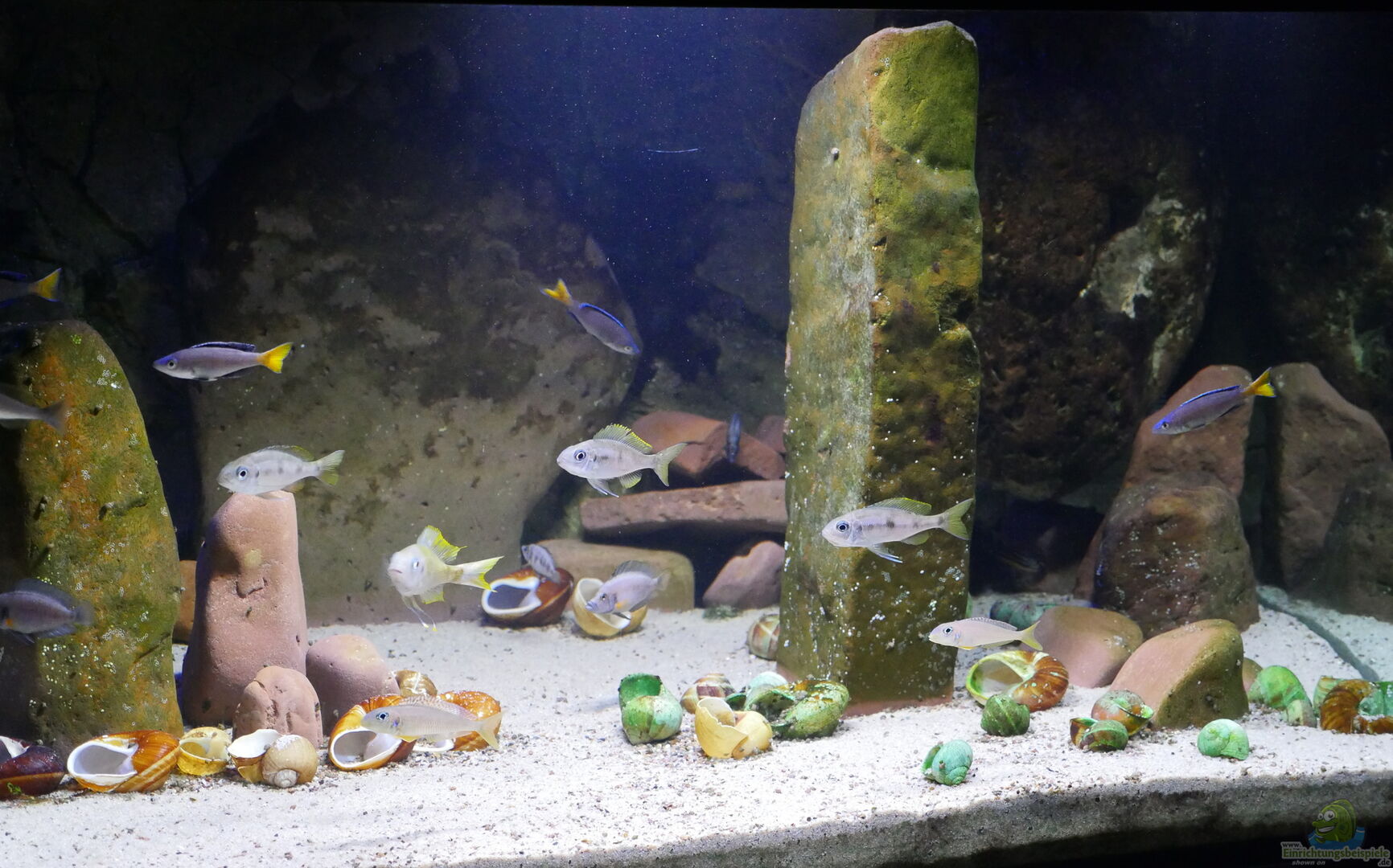 Standardbecken der Firma Aquarienkontor aus Haltern am See - Glasstärke 12 mm, Front- und Seitenscheiben aus Wei??glas - Unterbau aus Aluminiumprofilen mit Scherwänden aus 15mm starken Siebdruckplatten - Eingeklebte Back to nature Slimline Red Gneis Rückwand. Ziel des Projekts war es, steile Felswände (Rückwand und hängende Felsmodule) als Lebensraum für Cyprichromis sowie eine durch stehende Felsen gut gegliederte (Reviergrenzen), sandreiche ??bergangszone nachzubilden, in der sich [...]