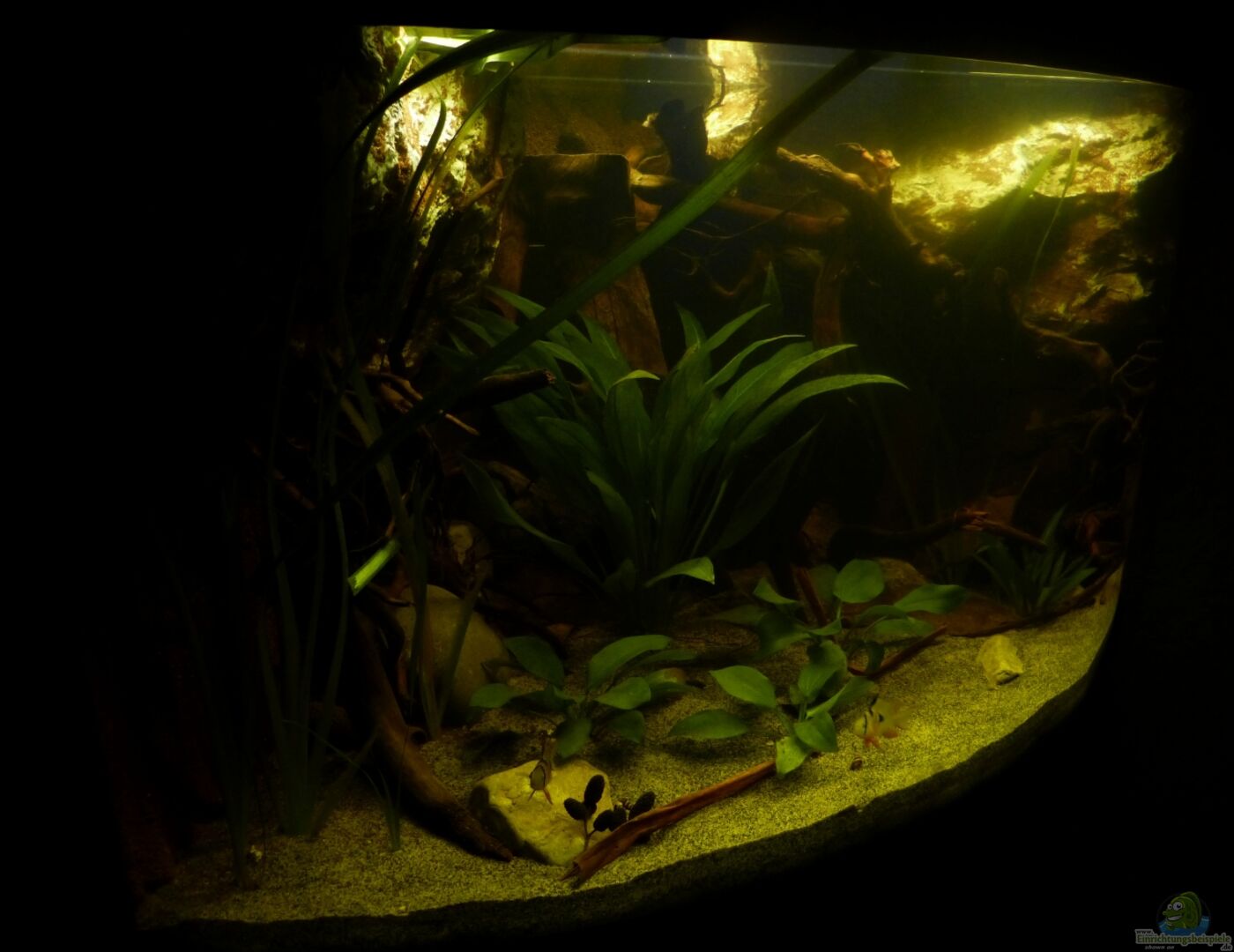 Ein paar Daten zum Aquarium vorweg: - wei??es Juwel Trigon 350 auf wengefarbenem Unterschrank mit wei??en Türen Schenkellänge 87 cm max.Tiefe 87 cm Gesamtbreite ca. 123 cm Floatglas: 15 mm - selbstgebauter Innenfilter in der hinteren Ecke - Aquarienabdeckung mit 2 Leuchtbalken, eigentlich mit 2 x 45 Watt T5 und 2 x 24 Watt T5 Leuchtbalken. Diese wurden auf LED-Beleuchtung "umgebaut"