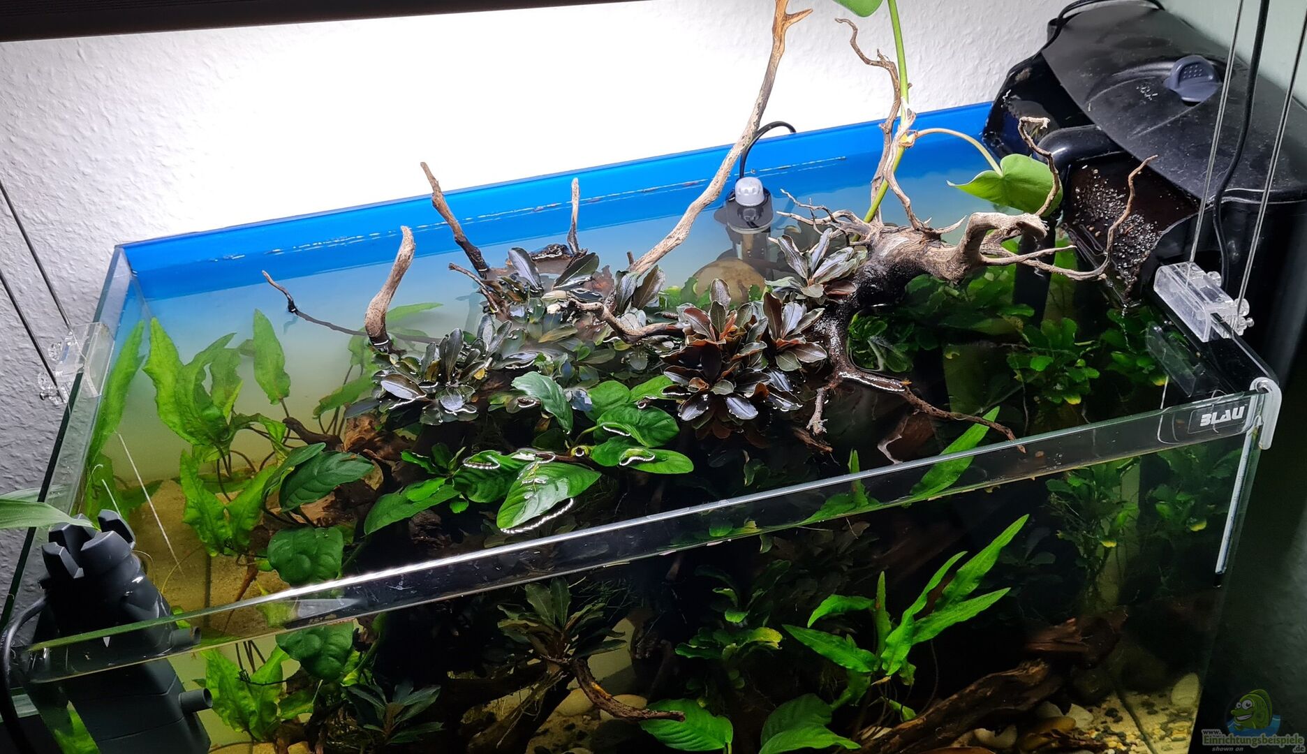 Dieses ist ein Blau "Cubic Nano"Aquarium. Es hat abgerundete Kanten im vorderen Bereich. Diese sorgen für eine schöne Frontalansicht. Das Aquarium wurde im Wohnzimmer auf einem Sideboard aufgestellt.
