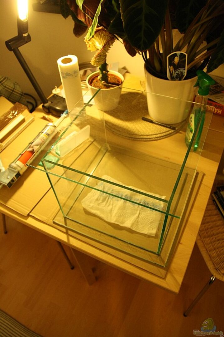 Seiten- und Bodenscheibe sind zwischen die Front- und Rückscheibe "schwebend" eingeklebt, so steht das Ganze nur auf der Front- und Rückscheibe. Dabei wurde so wenig Silikon wie möglich eingesetzt, damit nur die Scheiben in der Ansicht wirken.