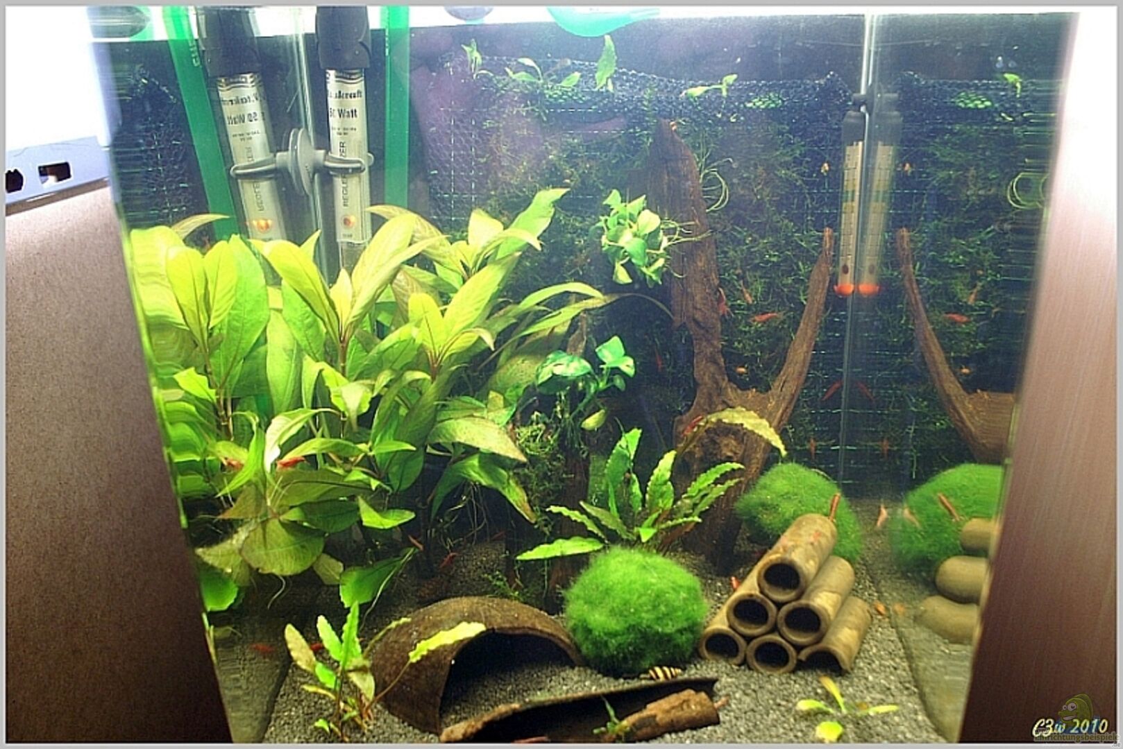 ´Kantenloses´ Becken mit nach vorn abgerundeten Ecken Das AQ steht auf unserem alten Telefontisch ;-) Rückwand aus einem ´Stoffsack´ welcher mit Saugnäpfen am Becken innen befestigt ist. Der Stoffsack ist ein Neylon Sack, der zuvor 14 Tage gewässert wurde. Zur Verbesserung der Stabilität ist im Innern des Stoffsacks das Drahtgeflecht auf welchem das Javamoos geliefert wurde eingesetzt. Schwarzer Hintergrund sind Reste meiner Unterlegematte von einem alten Becken