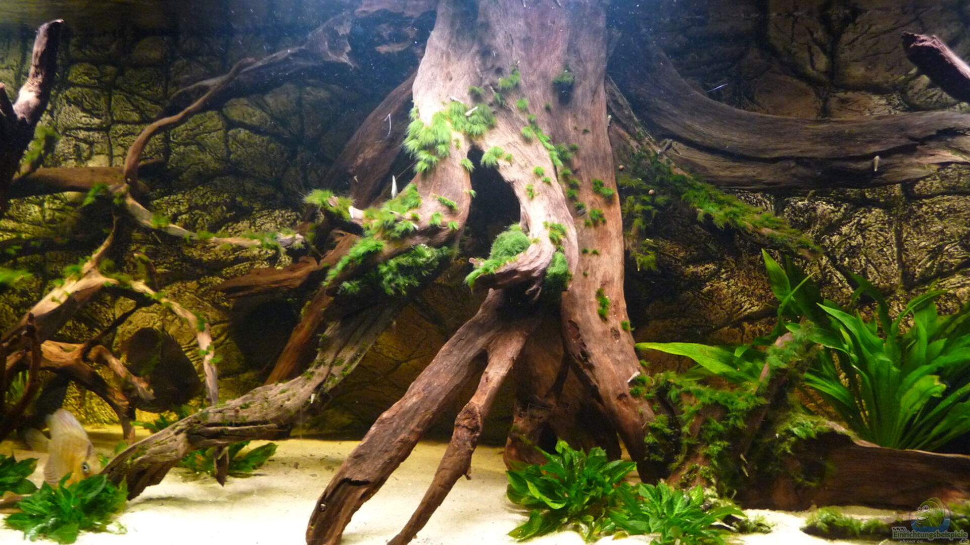 Rückwand aus Kunststoff, zusätzlich auch an den beiden Seitenscheiben. Steine 2 Stück, Grö??e ca. 10-20 cm. Die Steine befinden sich fast ausschlie??lich im hinteren Beckenbereich und dienen hauptsächlich dazu, die Rückwand zu fixieren. Sie sind zum grö??ten Teil im Bodengrund verborgen und fallen dadurch kaum auf. Wurzeln aus dem Zoofachhandel (verschiedene Sorten). Um gro??e Wurzeln zu erhalten, habe ich mehrere einzelne Wurzeln mit Kabelbindern und Edelstahlschrauben verbunden. [...]
