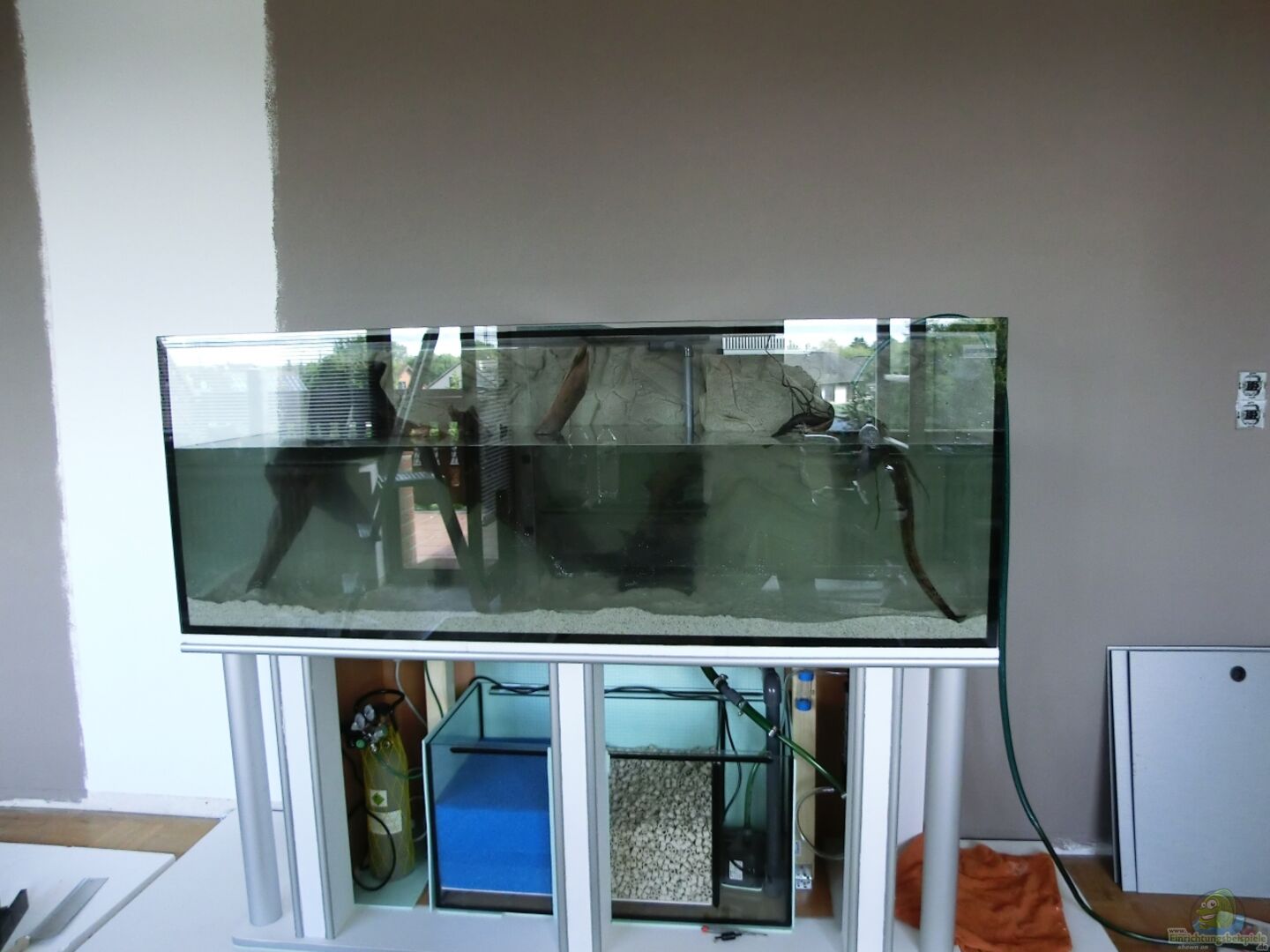 Becken Das Becken wurde am 29.06.2012 bei MAT (Meyer Aquarien Technik) aus Klein Lafferde bestellt. Es ist sto??verklebt mit Sicherheitsinnennaht und 12mm Glas. Au??erdem hat es 2 40er Bohrungen und einen 20x20 cm ??berlaufschacht. Zur Stabilität hat das Becken 2 Seitenstreben und eine Mittelstrebe. Die Lieferung erfolgte am 21.09.2012. Am nächsten Tag wurde es dann zu 4. in den ersten Stock getragen. Um es besser tragen zu können, wurde es mit der Bodenplatte nach oben zeigend getragen. [...]