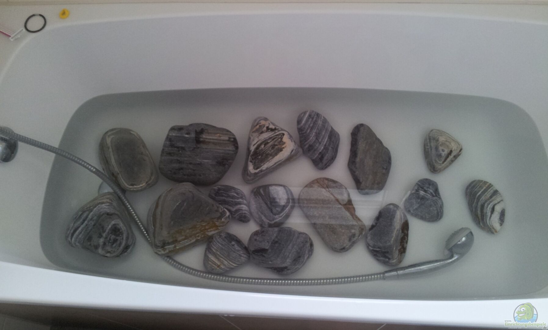 Hier wurden 36 kg Flusskiesel im Aquarium verteilt. Diese haben wir vom hiesigen vom Steinhändler bezogen, Herkunft soll das Algäu sein rund um Kempten. Färbung Grau mit weissen Quarz durchzogen. Die Steine wurden auf einer Plexiglassplatte (stärke 6 mm) im Aquarium aufgestellt.