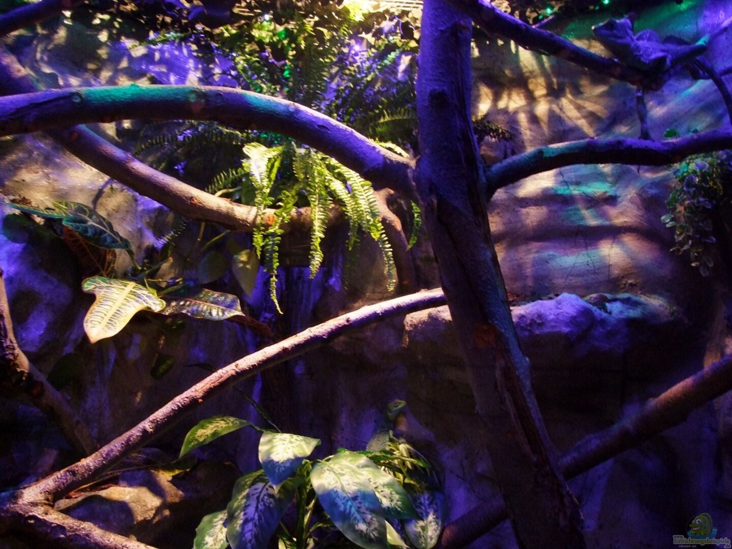 Im Auarium sind ein paar Wurzeln und ein paar Steine Die Rückwand geht nahtlos als Ufer in den Boden des Landteils über Die Einrichtung im Landteil besteht überwiegend aus Apfelbaum und Kirschbaum ??sten aus dem Garten sowie ein paar Steinen die als Zone ohne Bodengrund dienen. Eine Eiablagestelle für Lucy gibt es im hinteren Bereich (Dicker Bodengrund, versteckt hinter der Kunstpflanze, warm und viel Regen - also feucht)
