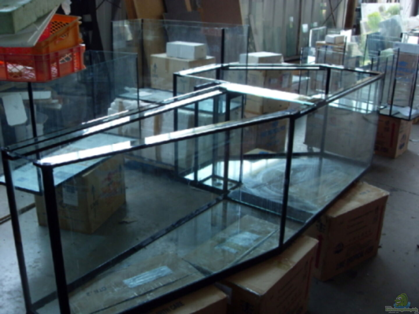 ein etwas anderes Aquarium ( Form ) Sonderanfertigung vom Aquarienbauer in der Nähe . Die Scheiben sind aus 12mm Floatglas und Wulstverklebt ( Nähte innen mit Glasstreifen abgedeckt ). Der Unterschrank ist ein Eigenbau aus Spanplatten und Ytong-Steinen , verkleidet mit Gipsplatten (grün) , nach dem verspachteln mit Streichputz gestrichen und zum Teil mit Antik-Bruchsteinen verkleidet. Die Beckenform hat sich nach langem planen so ergeben und hat sich gut in die Wohnung eingefügt . ===================================================== [...]
