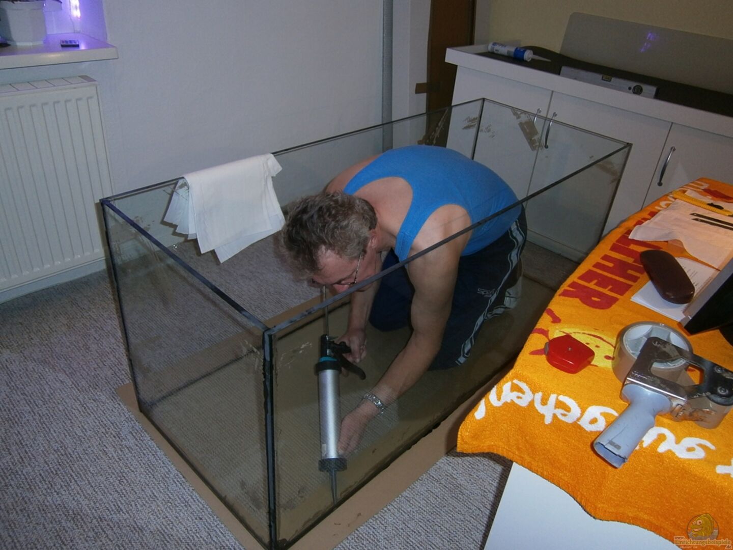 Das Becken habe ich selbst geklebt.12 mm Glas, Sto??verklebt mit innerer Kehlnaht.Es hat einen 6-Kammer Bioinnenfilter über die gesammte Länge.