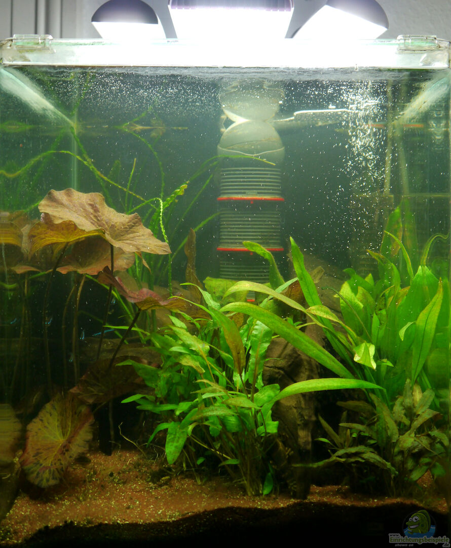 Die Heizung erfolgt durch eine Bodenheizung (JBL ProTemp basis, 10W). Während in den Sommermonaten die Herausforderung eher darin besteht, das Becken zu kühlen (habe dafür im September den NanoCoolAir Eco von Dennerle gekauft, der allerdings noch nicht zum Einsatz gekommen ist), wird die Bodenheizung im Winter durch einen 50W-Heizstab von EHEIM unterstützt. CO2-Düngung erfolgt durch das Dennerle Bio-CO2-Set (versorgt das Aquarium etwa 30 Tage lang mit CO2, wird daher einmal im Monat gewechselt) [...]