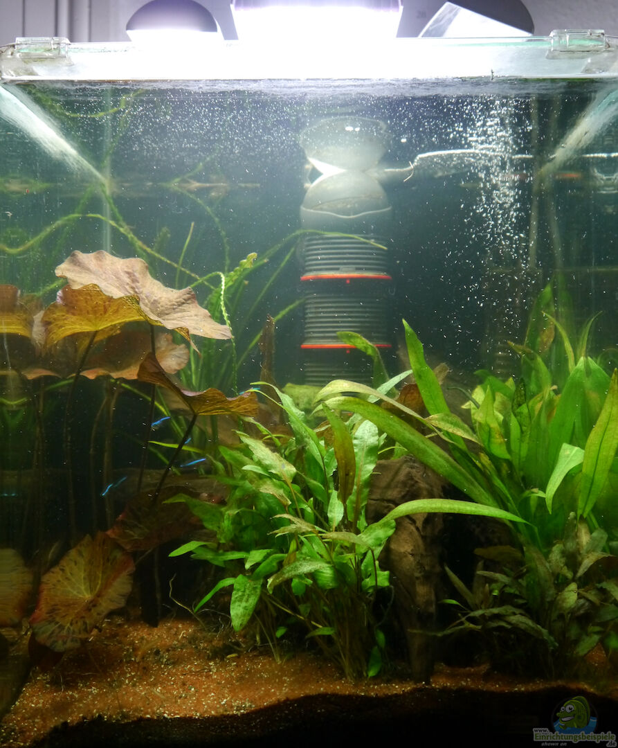 Die Heizung erfolgt durch eine Bodenheizung (JBL ProTemp basis, 10W). Während in den Sommermonaten die Herausforderung eher darin besteht, das Becken zu kühlen (habe dafür im September den NanoCoolAir Eco von Dennerle gekauft, der allerdings noch nicht zum Einsatz gekommen ist), wird die Bodenheizung im Winter durch einen 50W-Heizstab von EHEIM unterstützt. CO2-Düngung erfolgt durch das Dennerle Bio-CO2-Set (versorgt das Aquarium etwa 30 Tage lang mit CO2, wird daher einmal im Monat gewechselt) [...]