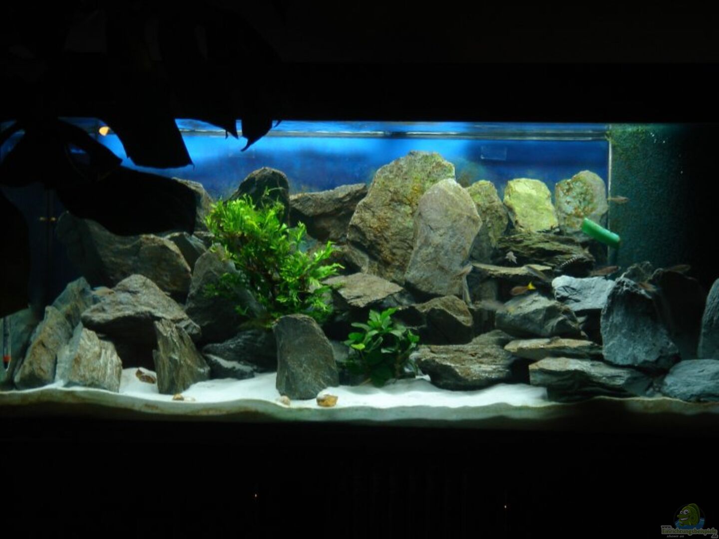 zwei Kabelkanäle als Aufnahmeführung für den HMF mittels Aqauriensilikon verklebt, Dekorplatten von 4mm Stärke in Schwarz, auf der Rückseite mit blauer Abtönfarbe bestrichen, an drei Seiten des Beckens mittels doppelseitigem Klebeband befestigt