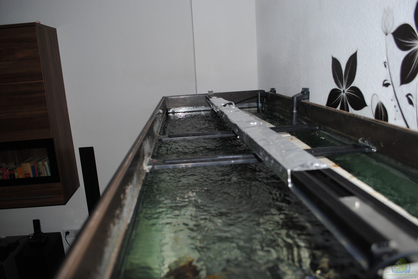 Eigens gebaute Rückwand. Die Rückwand wurde aus Styropor gefertigt, welches ich mit einem Hei??luftfön bearbeitet habe um die Musterung annähernd hin zu bekommen. Hinter der Rückwand ist die Technik verbaut worden um vorn ein eingerma??en ungestörtes Bild zu bekommen. Hinter den Steinafbauten ist ein Loch gebrannt worden um eine Wasserzirkulation von vorne nach hinten zu gewährleisten. Allerdings war dies meine erste Rückwand weswegen sie nicht wirklich perfekt ist und auch nicht [...]