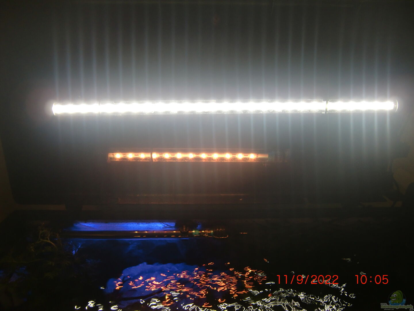 2x digitale Zeitschaltuhr für die Beleuchtung 1x digitales Thermometer auf dem AQ mit Kabelfühler im Becken 1 Heizstab 50 Watt Sprudelstein, kleine Dosis eingestellt, Tetra Pumpe 50l/h steht im Nebenraum, versorgt 2 Becken