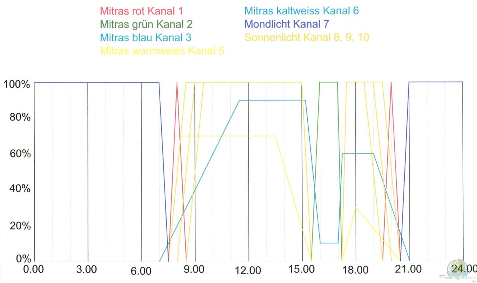 Beregnungsanlage: Für den automatischen Wasserwechsel gibt es eine Regensimulation. Im Unterschrank ist hinter der RO-Anlage ein Dennerle Nanocube 60 als Regenwassertank eingebaut. Dieser wird von der Osmoseanlage gefüllt, bis ein Niveausensor bei vollem Tank anspricht. Wenn Gewittertag ist, wird dieses Wasser, von einem 75W Heizstab auf 25 Grad vorgewärmt, über eine Pumpe hochgepumpt. Unter den Abdeckplatten des Aquariums habe ich insgesamt 65 Gardena-Bewässerungstropfer angeklebt, über [...]