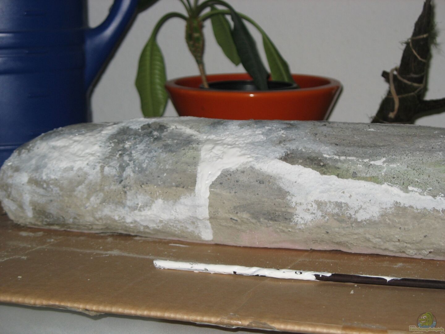 Rückwand: 2 Selbst gemachte Module jeweils in der linken und rechten Beckenhäfte. Das rechte Modul ist mehr ein grö??erer Felsen, an der tiefsten Stelle ca 20 cm tief und hinterschwimmbar. Der Felsen wurde mit Portlandzement und Baugittergewebe modelliert und danach mit Breddermann E 45TM versiegelt. Dieses Modul ist ein sehr massiges und schweres Teil, das etwas schräg gegen die Rückwand gelehnt wurde. Zum Schutz für die Scheibe sind Stücke groben schwarzen Filterschaumes an dem [...]