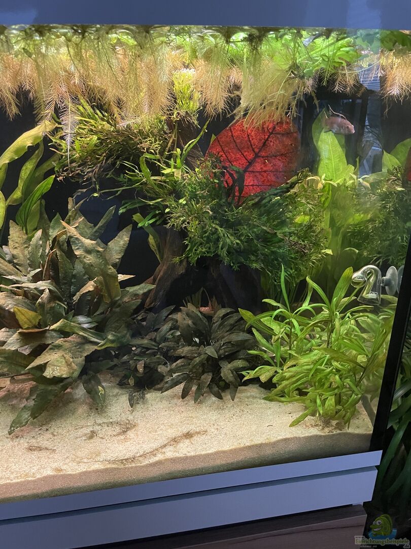 Steinaufbau aus Drachensteinen und massig Wurzelholz (hauptsächlich Moorkien). Die Steine sind mit verschiedenen Anubien bepflanzt, die Moorkien mit Javamoos. Die übrig gebliebenen Bruchstücke der Wurzeln habe ich für die Einrichtung genutzt und sie einfach im Becken verteilt. Auf der rechten Seite des Beckens steht eine gro??e Mangrove, bepflanzt mit Kongofarn und Windelov Javafarn. Ein paar Mooskugeln runden das Bild ab.