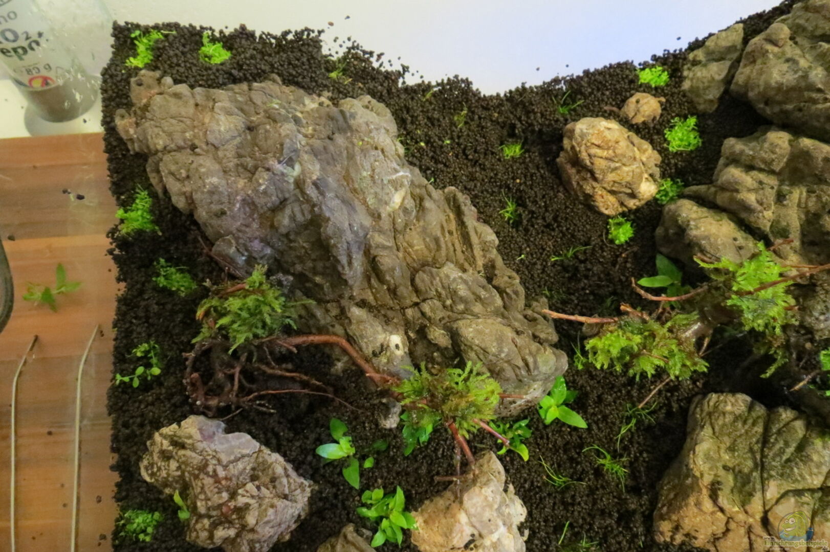 Dies ist mein erstes Becken im Bereich Aquascaping. Bei dem Becken handelt es sich um ein Nano Becken der Firma "blau Aquaristik". Das Becken hat abgerundete Kanten an der Frontscheibe und ist hinten transparent verklebt. Die Rückwandbeleuchtung ist selbst gebaut (siehe "Sonstiges").