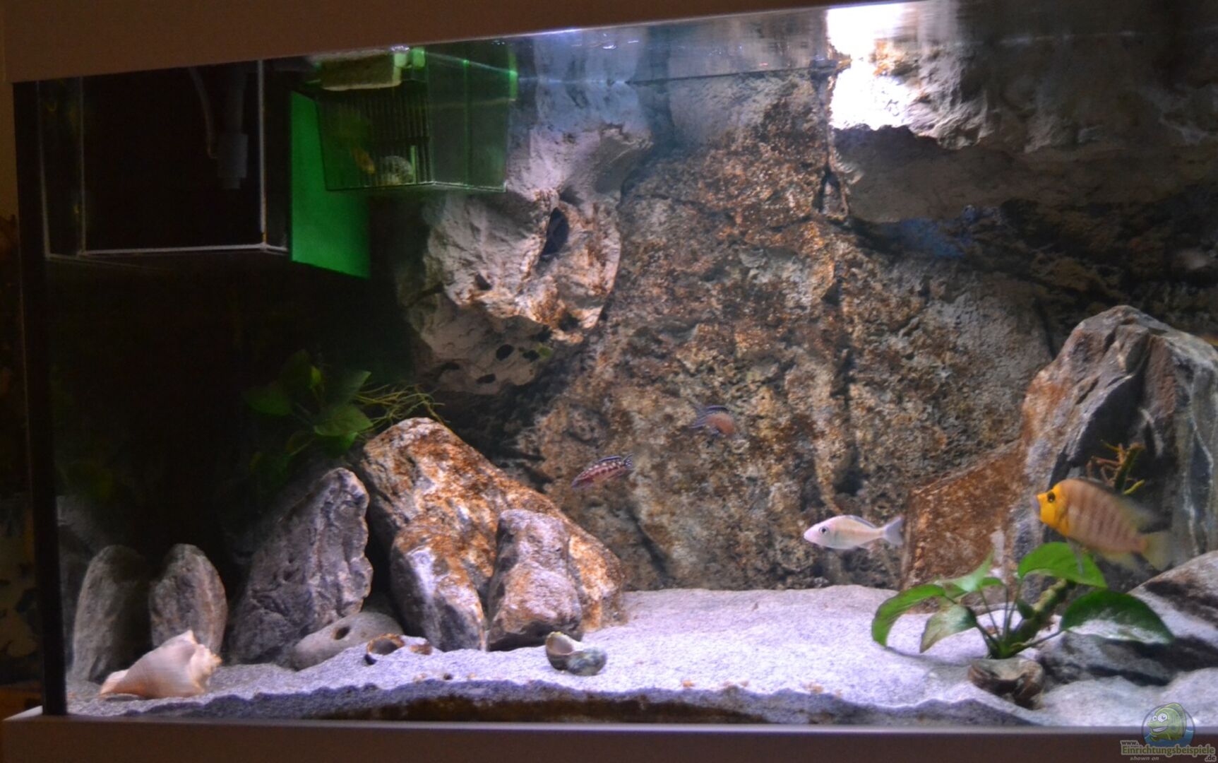 Standardbecken von Friedeberg Aquarienbau. Der Unterschrank, die Kiesblende und die Abdeckung sind in Perlwei??-Dekor gehalten.