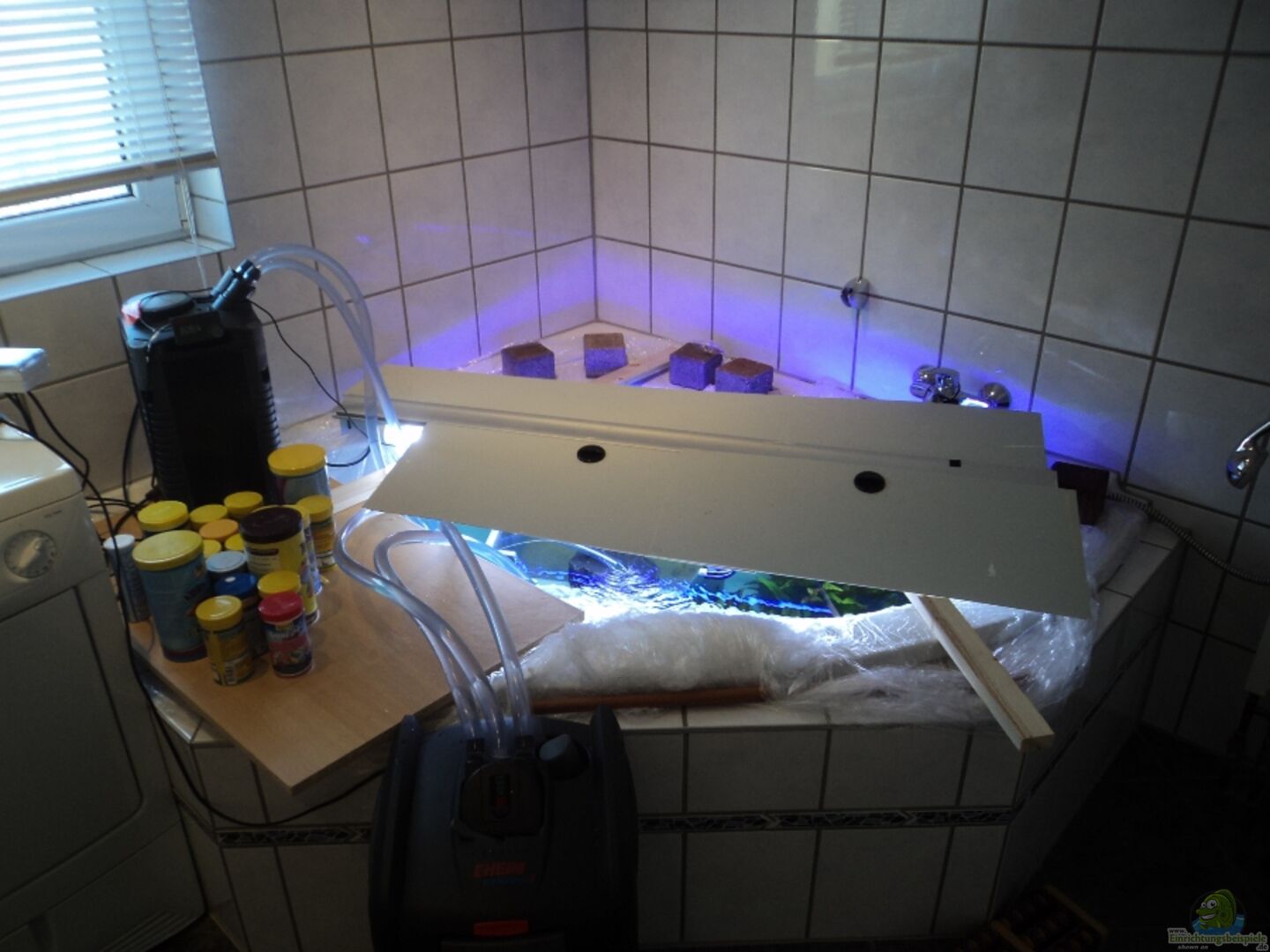 Das Becken ist aus 17 mm Floatglas gefertigt und ist sto?? Verklebt. Die Abeckdung ist ein Aluminiumabdeckeung mit zwei T5 Leichten und zwei Futterklappen. Das Becken ist eine Sonderanfertigung , um möglichst viel Wasservolumen zu bekommen habe ich die Höhe von 90 cm gewählt . Eine andere Grö??e wäre nicht gegangen weil es sonst nicht genau in die Ecke gepasst hätte. Den Unterschrank habe ihn komplett selber gebaut. Der Unterschrank steht auf altem Gewebeteppich um die Unebenheiten [...]
