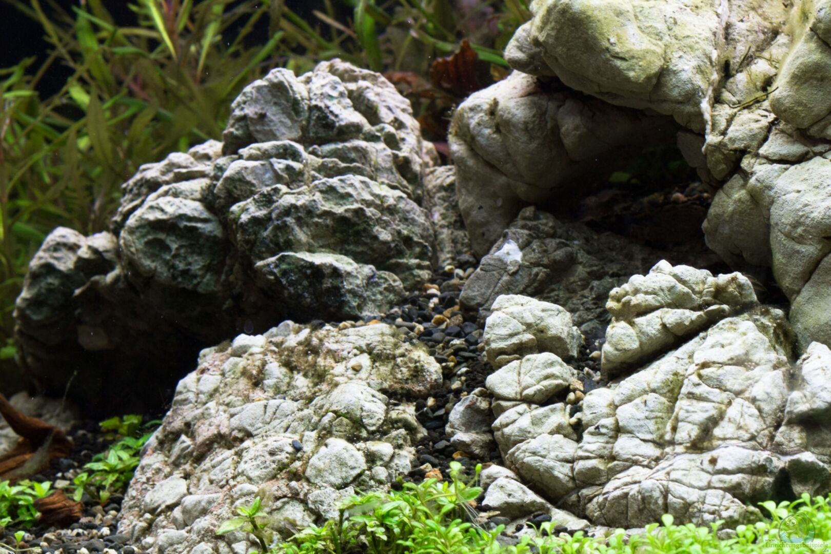 Als Dekoration wurde reichlich Leopardengestein (~50kg) und vereinzelt Wurzelstücke (Menkong Wurzel) mittig zu einer Felslandschaft mit Bergen und Verstecken drapiert. Generell, wie sollte es anders sein, ist sehr sehr viel Technik in diesem Schaubecken verwendet worden, siehe Technikrubrik.