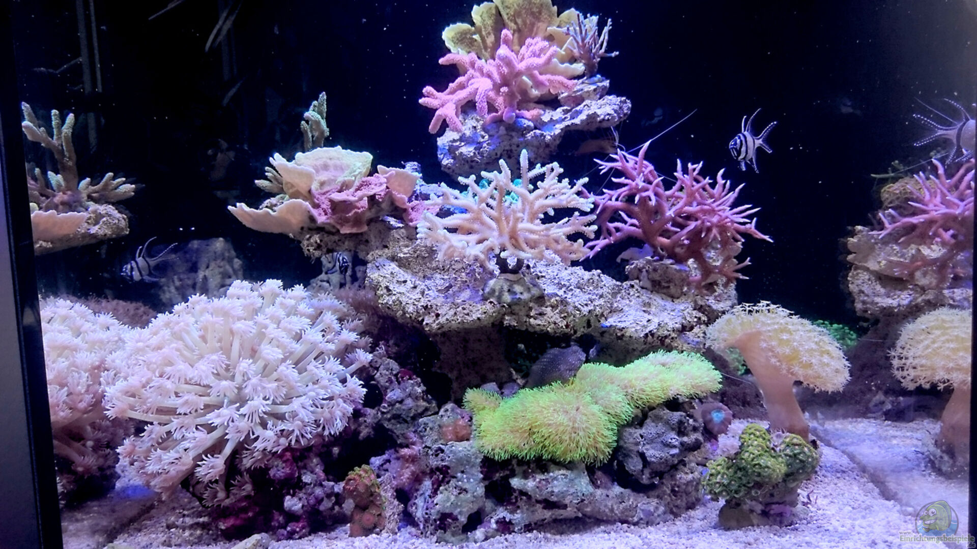 Ich habe das Becken anfänglich nur mit Riffkeramik und den Sangokai Basics gestartet. Die ersten Korallen zogen nach einigen Tagen ein und die meisten SPS nach zwei Wochen. Nach und nach habe ich zur Erweiterung der Biodiversität und für mehr Stellplatz noch etwa 4KG Lebendgestein eingesetzt.