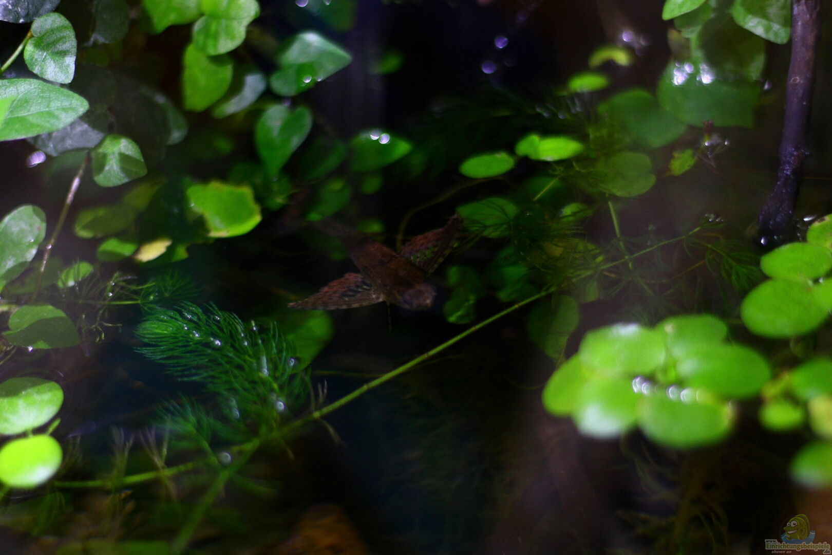 3x Pantodon buchholzi ?/? Heimat: Afrika. Langsam flie??ende Regenwaldbäche und -sümpfe West- und Zentralafrikas Temperatur: 25-30 °C pH-Wert: 6, 0-7, 0 Gesamthärte: 2-10 °dGH Beckengrösse: Pro Tier ca 50x50cm Oberflächenraum Haltung: Verschiedene Angaben, meist Gruppen oder Paarhaltung Ernährung: Anflugnahrung in Form verschiedener Insekten Den Oberflächenbereich bewohnt ein junges Paar dieser Schmetterlingsfische. Das Beckenvolumen wirkt zunächst [...]