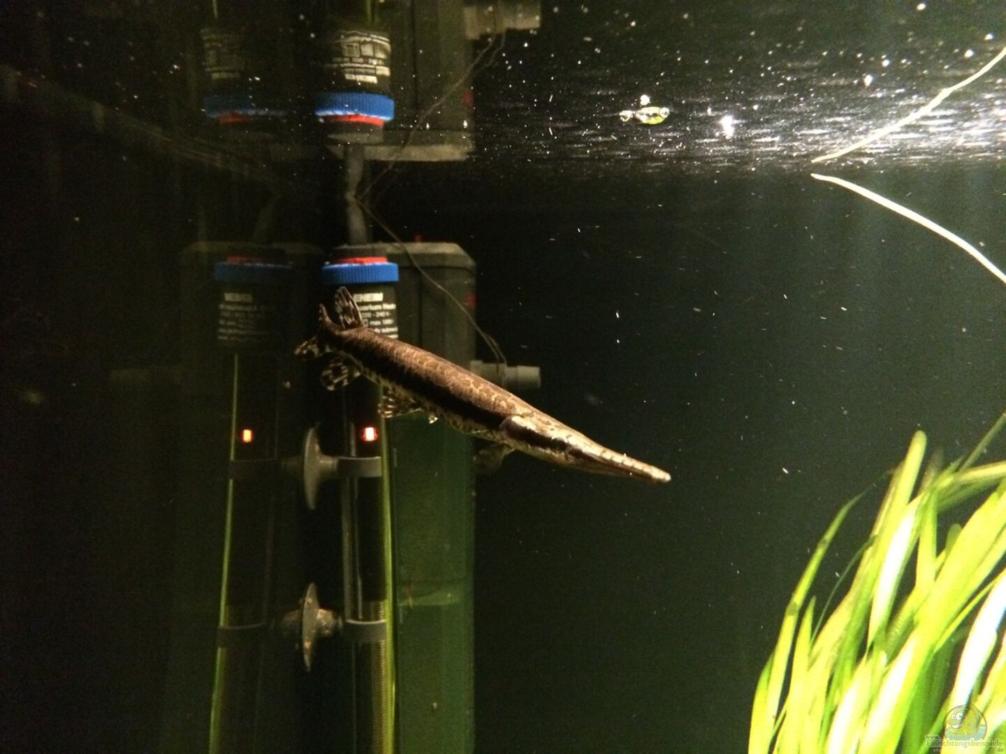 3x Gefleckter Knochenhecht Lepisosteus oculatus Grö??e ca. 13-15 cm Geschlechter wohl 1/2 (w/m). Ist in dem Alter noch schwer zu bestimmen. Aber einer wirkt etwas kräftiger und breiter. 1x Neolamprologus pulcher (sucht noch ein neues Zuhause) Ca. 20-50 Endeler Guppy Mix (je nach Appetit der Knochenhechte). Werden regelmä??ig aus eigener explodierender Zucht nachgefüllt oder vermehren sich selber im Becken. Wer einmal Guppies hatte wei?? wovon ich reden, der Millionenfisch. 1x [...]