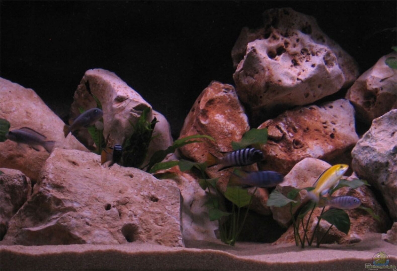 Labidochromis caeruleus yellow (1M/4W) Pseudotropheus elongantus ´Mpanga´ (1M/4W) Pseudotropheus solocofi (1M/4W) Da die Tiere noch sehr jung sind konnte mir der Züchter bei den Mpangas nicht 100%ig garantieren das es wirklich 1/4 sind. Er meinte es könnten auch 2/3 sein. Im Becken sieht es vom Verhalten fast so aus als wären es 2 Böcke. Aber wie mir scheint hat jeder seine Höhle und sie streiten sich nicht übermä??ig. Ich werde das Ganze im Auge behalten und gegebenfalls eingreifen. [...]