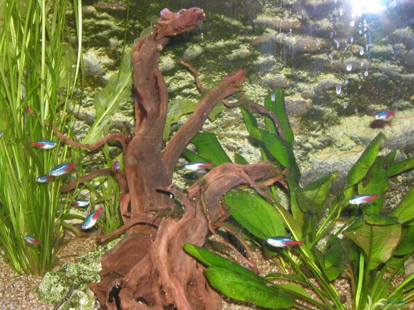 28 Neonsalmler (Paracheirodon innesi) 6 Glühlichtsalmler (Hemmigrammus erythrozonus) 4 Schachbrettschmerlen (Botia sidthimunki) 3 Metallpanzerwelse (Corydoras aeneus) 2 Blaue Fadenfische (Trichogaster trichopterus) 1 L-204 (Panaqolus sp.) und ne ganze Menge Posthorn- und Turmdeckelschnecken