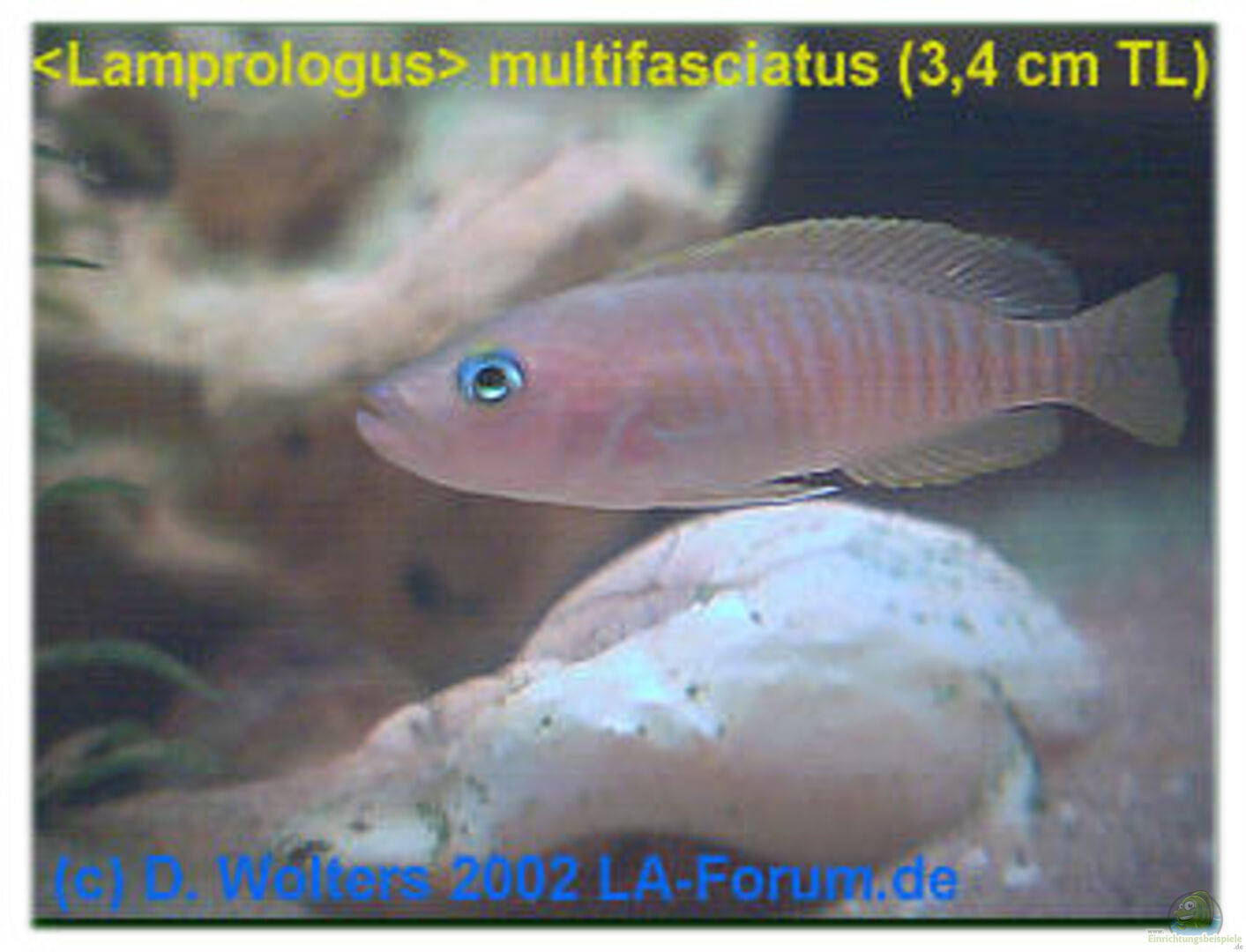 Nomenklatur nach KONINGS 1999 12 Fische: - ´Lamprologus´ multifasciatus, (2/5) - Neolamprologus buescheri ´Kamakonde´, (1/1) - Neolamprologus leleupi ´Karilani´ (1) - Lepidiolamprologus hecqui ´Mbete Isl.´ (1) - Neolamprologus tetracanthus ´Sambia´ (1 juv.)