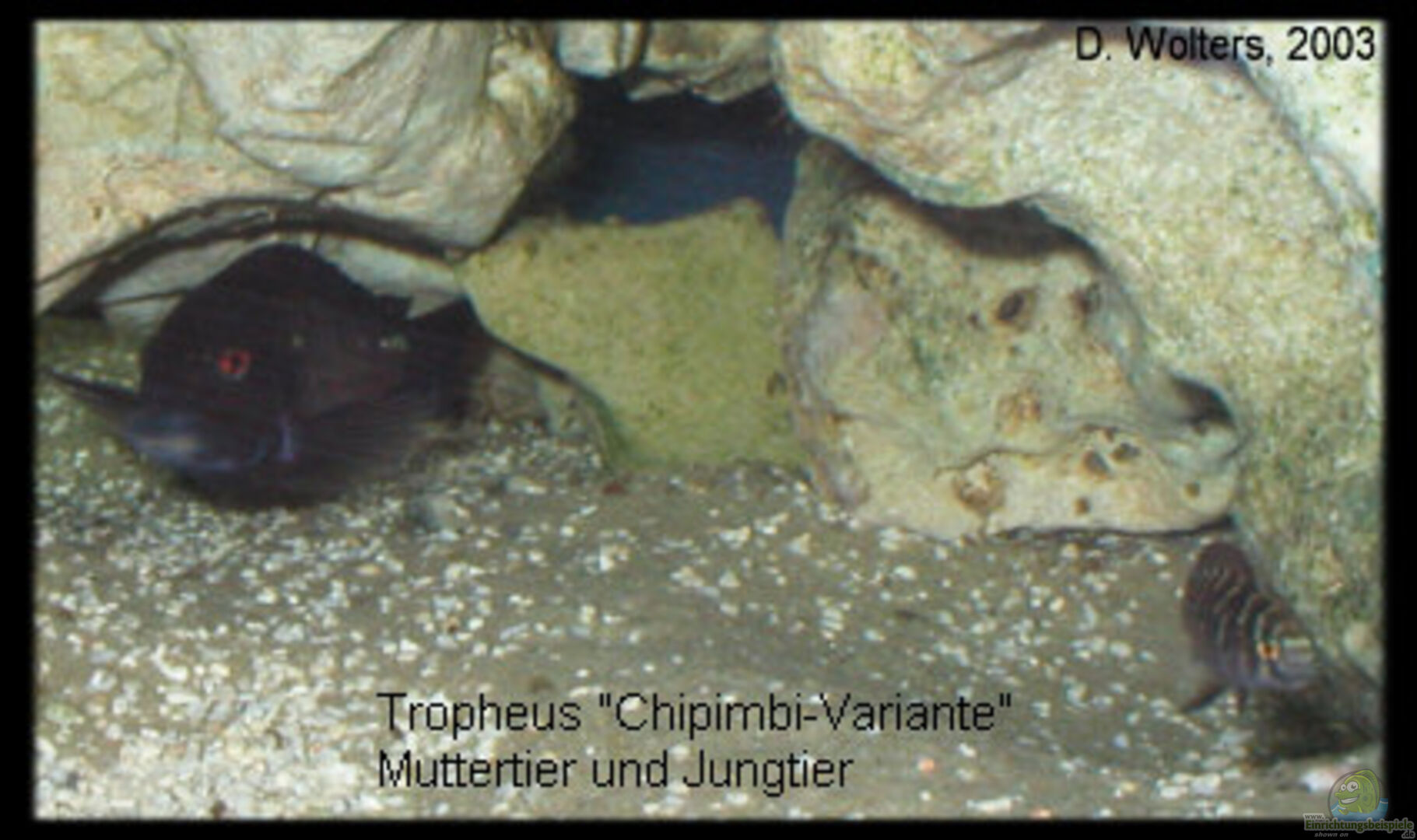 Tropheus sp. ´red´ (nach Konings 1999) Geografische Varianten: a) Cape Chipimbi (Kipimbi) DR Kongo (Zaire) - 3M/11W/6j ´Roter Schwanzstreifen-Moorii´ b) Cape Kachese (Sambia) - 2M/7W/- ´Gelber aus Sambia´ c) als Begleiter: Eretmodus cyanostictus Sambia (Paar) d) 2 Tanganjikasee-Stachelwelse Lophiobagrus cyclurus