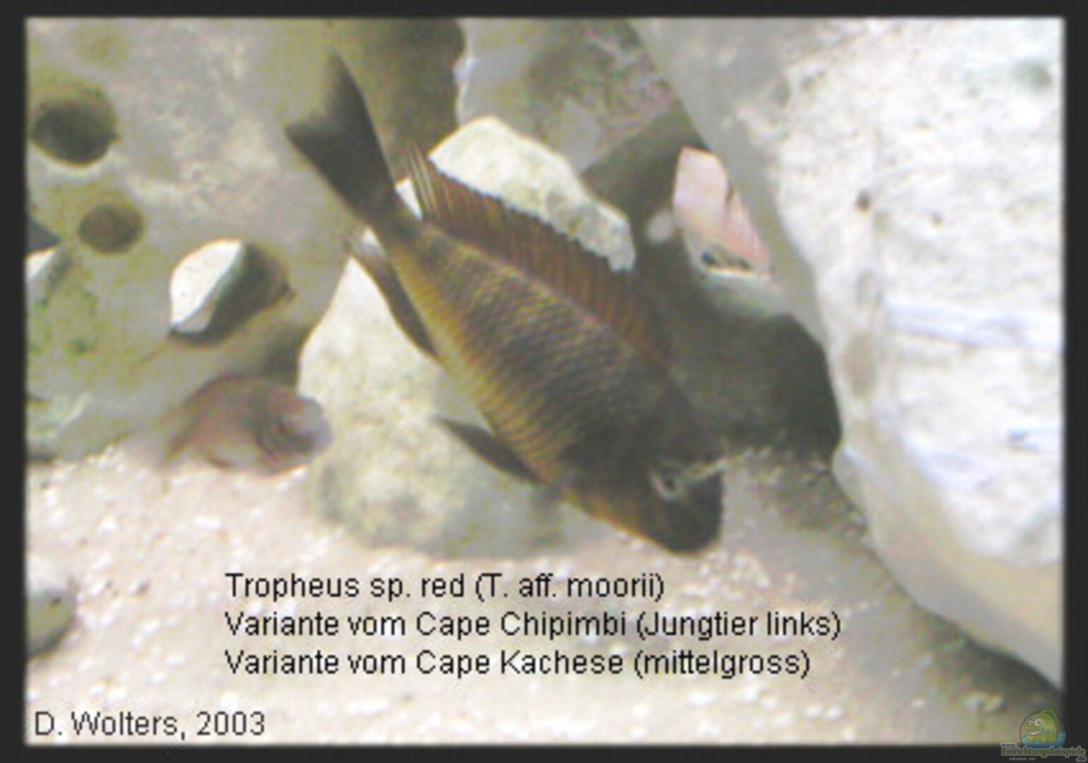 Tropheus sp. ´red´ (nach Konings 1999) Geografische Varianten: a) Cape Chipimbi (Kipimbi) DR Kongo (Zaire) - 3M/11W/6j ´Roter Schwanzstreifen-Moorii´ b) Cape Kachese (Sambia) - 2M/7W/- ´Gelber aus Sambia´ c) als Begleiter: Eretmodus cyanostictus Sambia (Paar) d) 2 Tanganjikasee-Stachelwelse Lophiobagrus cyclurus