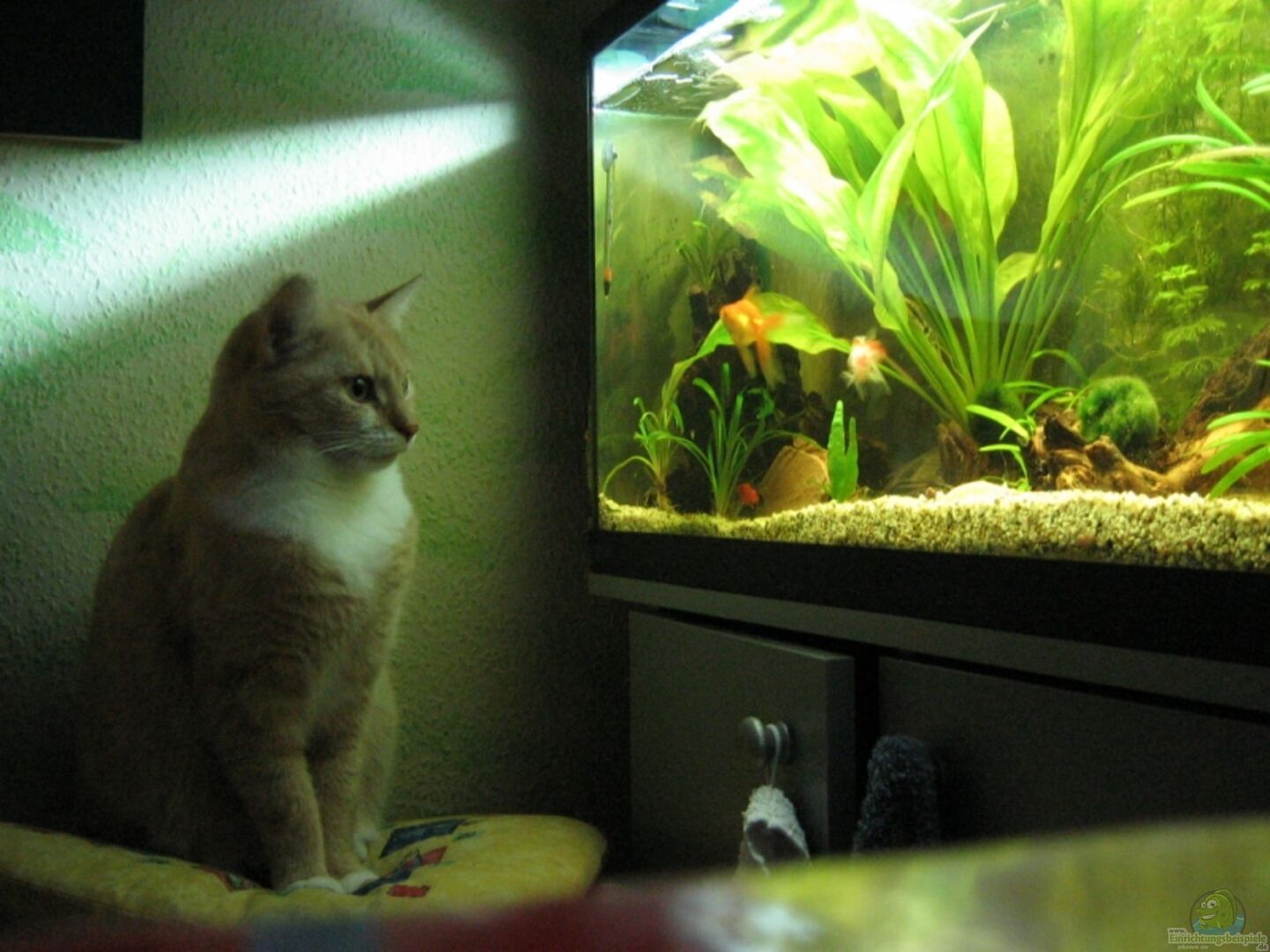 4 Schleierschwänze (mein ganzer Stolz sher prächtige Tiere 3 haben eine wei??e Zuchtfärbung) 2 Goldstreifenpanzerwelse/Metallpanzerwels (Corydoras aeneus, lat. aeneus ??? bronzen, kupfern) 2 Scheibenwelse (ca.2-3, 5cm) Und ein Animatuer: Mein Kater
