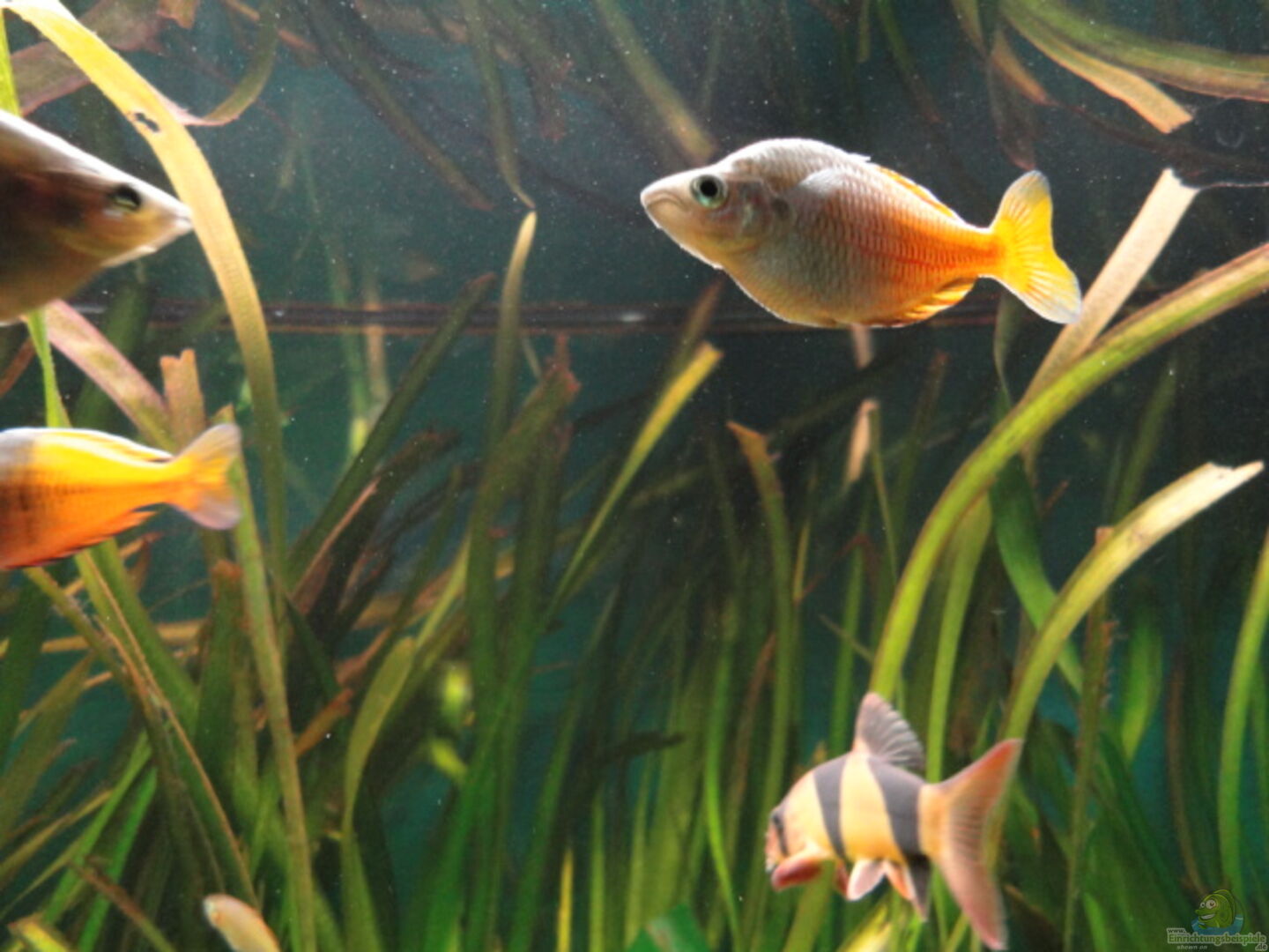 die teilweise bereits 8 Jahre alten Fische wurden beim Auflösen des früheren Aquariums mit übersiedelt, deshalb sind einzelne "Restfische" vorhanden. Nach deren natürlichem Ableben werden einige bestehende Schwärme erweitert. 9x Regenbogenfische Boesemani 1x Juwel-Regenbogenfisch 3x Rot-Blauer Kolumbianer 1x Antennenwels 1x L204 3x Prachtschmerle
