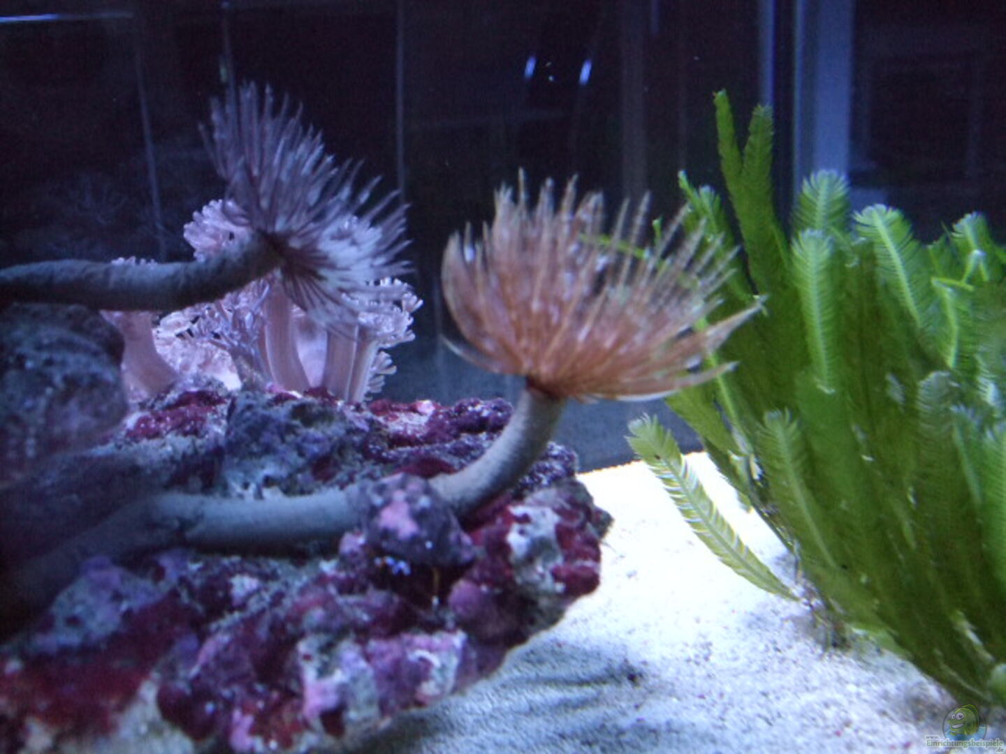 - 2 Amphiprion ocellaris - 1 Synchiropus splendius ( Mandarinfisch- ist an Artemia und Mysis eingewöhnt versuche nun Granulatfutter) - 1 Salarias Fasciatus - 1 Nemateleotris decora ( Dekor-Schwertgrunde l) - Sacrophyton Ehrenbergi - Ableger als Testkoralle, Mutterkoralle - Clavularia viridis ( Grüne Röhrenkoralle ) - Xenia umbellata - Tridacna maxima - kleine Entacmaea quadricolor ( Blasenanemone ) - Ricordea florida - Krustenanemonen ( Zoanthus ) - Heliofungia actiniformis - [...]