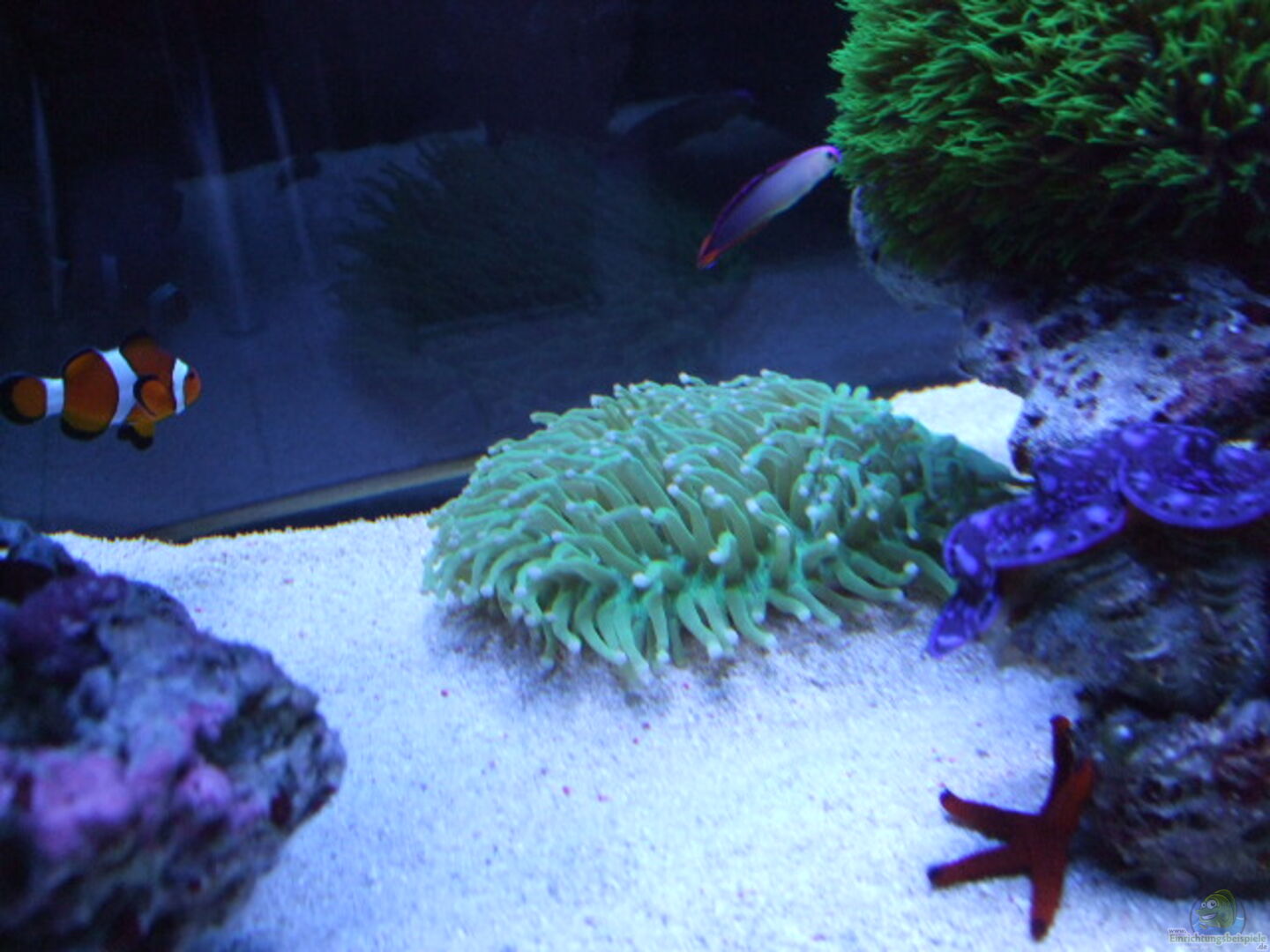- 2 Amphiprion ocellaris - 1 Synchiropus splendius ( Mandarinfisch- ist an Artemia und Mysis eingewöhnt versuche nun Granulatfutter) - 1 Salarias Fasciatus - 1 Nemateleotris decora ( Dekor-Schwertgrunde l) - Sacrophyton Ehrenbergi - Ableger als Testkoralle, Mutterkoralle - Clavularia viridis ( Grüne Röhrenkoralle ) - Xenia umbellata - Tridacna maxima - kleine Entacmaea quadricolor ( Blasenanemone ) - Ricordea florida - Krustenanemonen ( Zoanthus ) - Heliofungia actiniformis - [...]