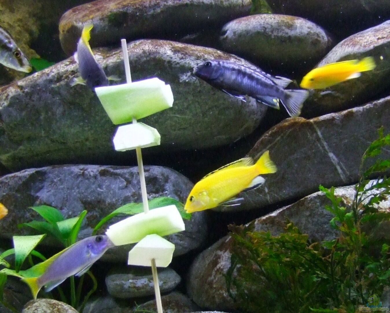 Labidochromis Cearuleus (Yellow) 1/3 Pseudotropheus acei 1/3 Iodotropheus spengerae 1/3 Melanochromis johanni 1/3 Dimidichromis compressiceps 2 (werden das Becken aber wieder verlassen, wenn sie grö??er sind gehen sie zu einem Bekannten ins grö??ere Becken)