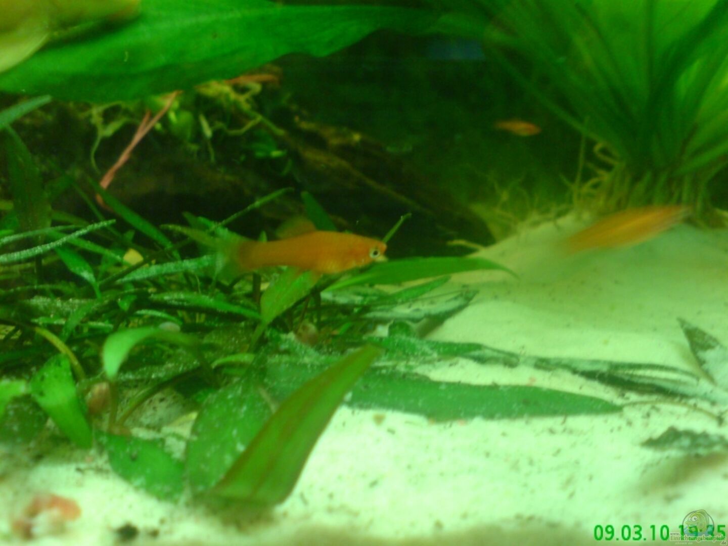 16 Schwertträger (3 Männchen + 14 Weibchen ) , 1 grosser Neon ( gnaden Brot ) , 1 Gelbe Saugschmerle , 1 Bergwasser Fächergarnele , 4 Antennewels Babys , 4 Panzerwelse ( 2 Schleier , 2 Albino ) , 5 Platys ( 1 M + 4 W ) , 1 Hexenwelse , einige Posthornschnecken , 6 grosse Apfelschnecken ( 3 M + 3 W ) ,