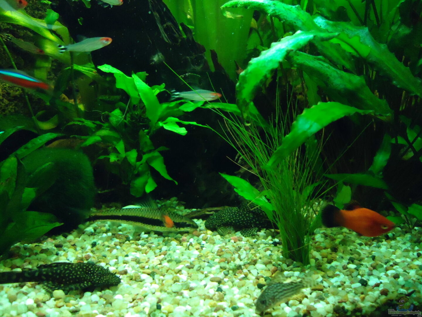 - 2 Skalare (Pärchen) - 10 Rote Neons - 12 Rotkopfsalmler - 2 Siamesische Rüsselbarben - 3 Antennenwelse - 1 Prachtschmerle (wurde uns früher alleine als Schneckenfressender Fisch verkauft, überlege aber ob 2 mehr?) - 2 Fächergarnelen - 6 Amanogarnelen (ausgewachsen) - 6 Orange Schönflossenpanzerwelse - Corydoras sterbai