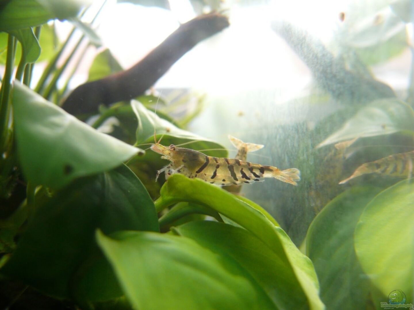 7 Caridina cf. cantonensis var. `Tiger` Waren zwar als `blaue Tigergarnelen` bezeichnet, blaugrau ist aber nur eine, die anderen sind unterschiedlich gezeichnete `normale` Tiger. Posthornschnecken