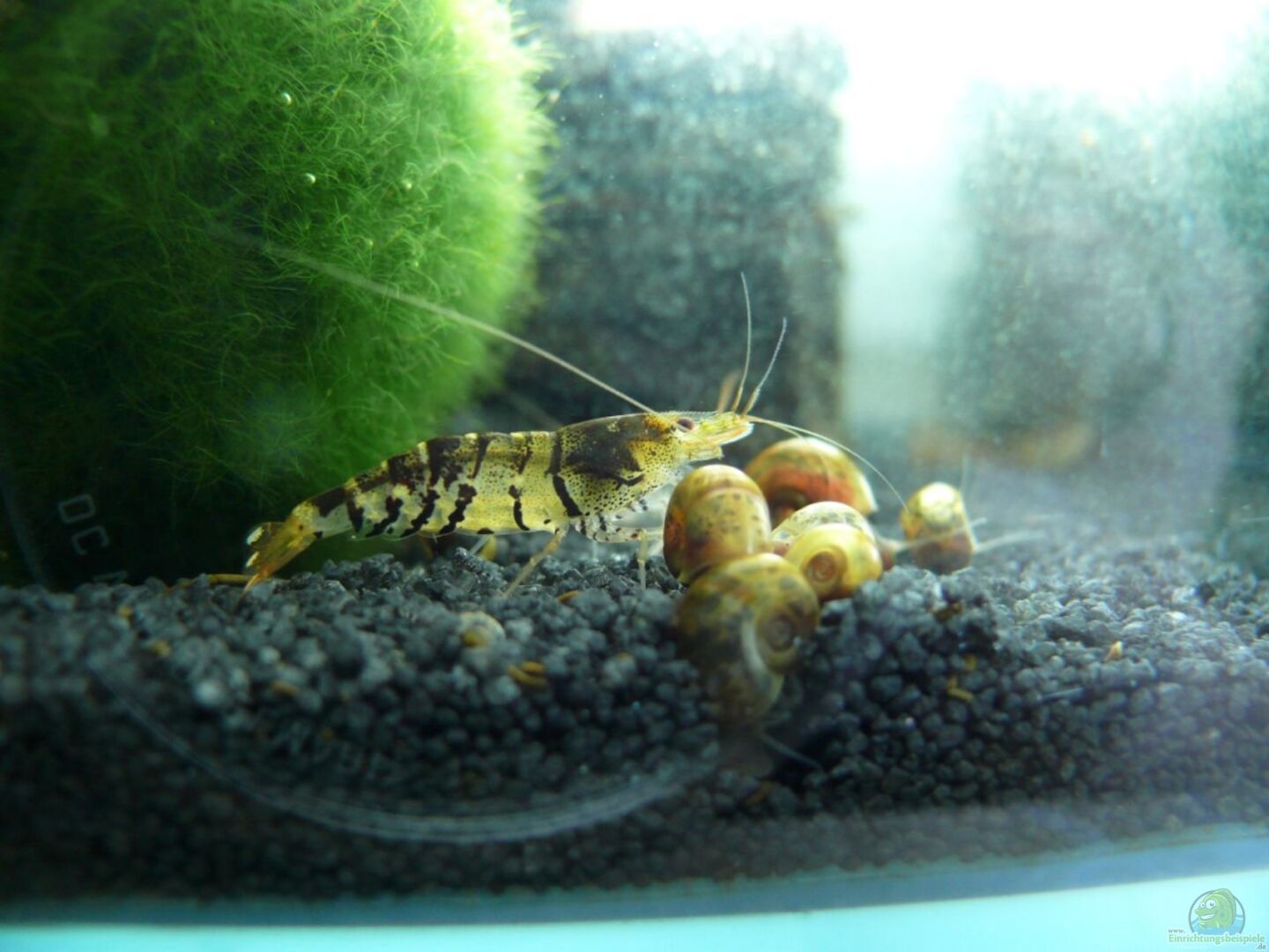 7 Caridina cf. cantonensis var. `Tiger` Waren zwar als `blaue Tigergarnelen` bezeichnet, blaugrau ist aber nur eine, die anderen sind unterschiedlich gezeichnete `normale` Tiger. Posthornschnecken