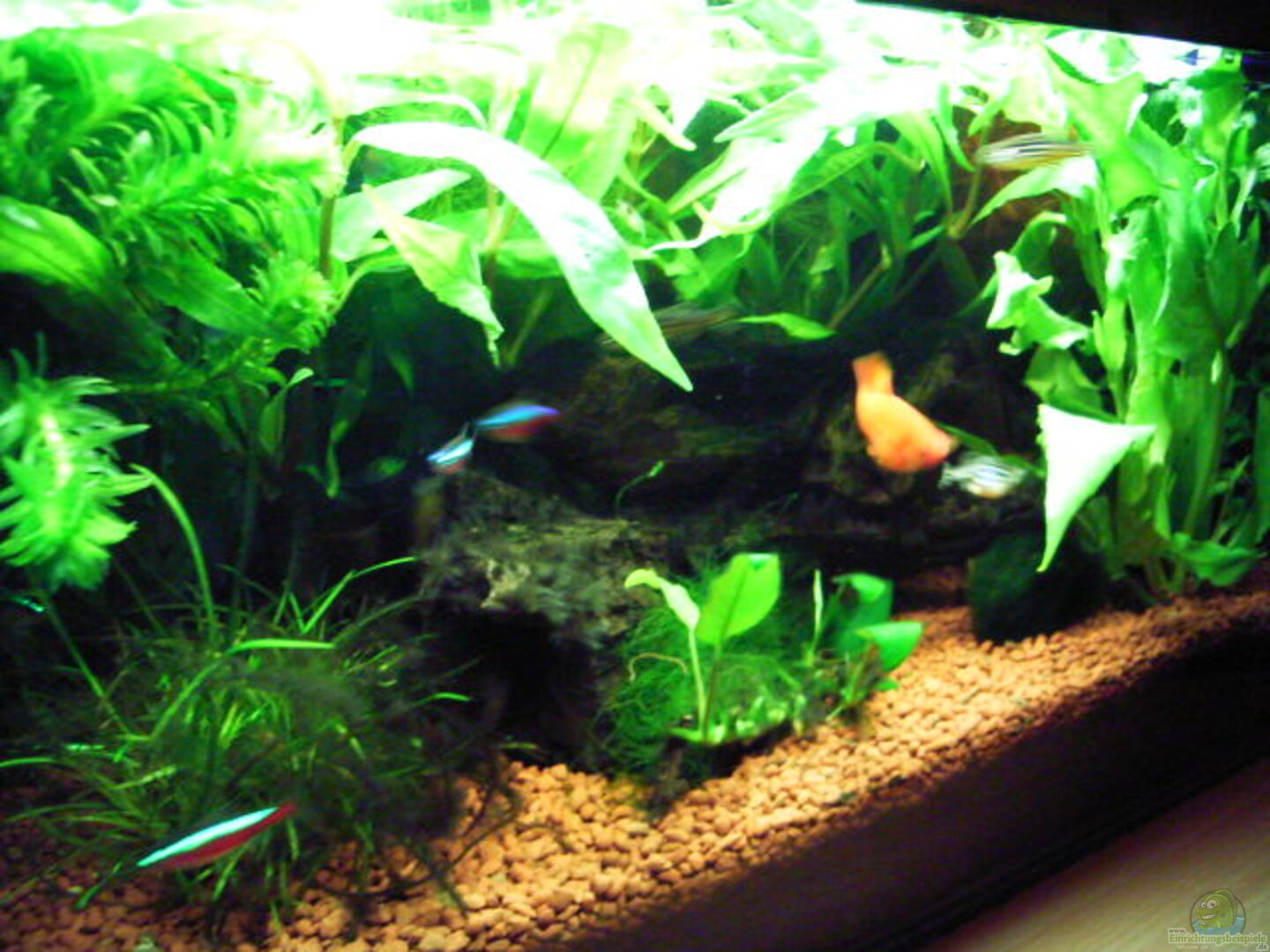 jede menge Guppys 5 Zebrabärblinge (Brachidanio Rerio 3m/2w) 6 blaurote Neons 4 Otocinclus 1 Kampffisch (gegen den Guppyüberbesatz) 10 Crystal-Red-Garnelen 5 Weiss-Perl-Garnelen