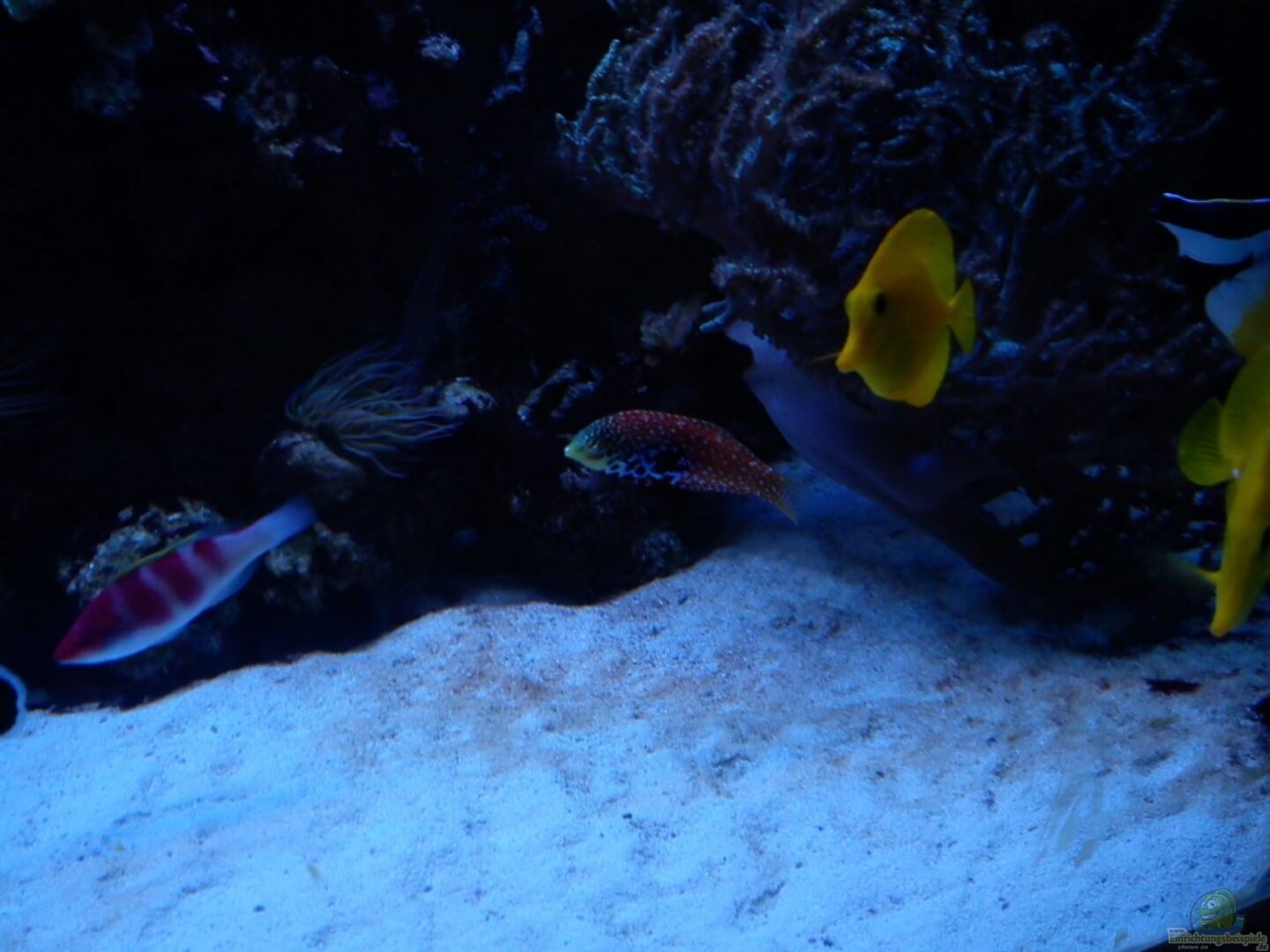 2 Zebrasoma flavescens, 2 Amphiprion ocellaris, 1 Cirrhilabrus flavidorsalis, 2 Labroides dimidiatus, 2Macropharyngodon bipartitus, 2 Valenciennea puellaris, 2 Cirrhitichthys falco, 2 Acreichthys tomentosus, 1 Gramma loreto, 2 Labroides dimidiatus, 1 Anampses twistii Diverse Weich-/Lederkorallen, z.B pumpende und nicht pumpende Xenien, Sarcophyton spec. div. Bäumchen, grüne Krustenanemonen, 2 rote Entacmaea quadricolor, Gorgonien, davon eine flächig wachsende Erythropodium caribaeorum uvm. Steinkorallen:z.B. [...]