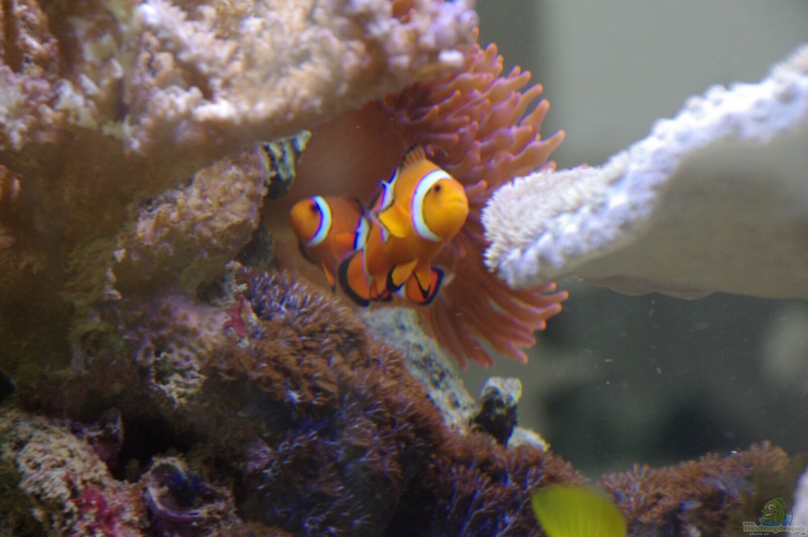 Fische: 3x Amphiprion ocellaris 2x Centropyge loricula 1x Zebrasoma flavescens 4x Sphaeramia nematoptera 4x Chromis viridis 1x Acreichthys tomentosus (zur Bekämpfung der Aiptasia) Wirbellose: div. Schnecken (darunter: Turbo tuberculosus, Cenchritis muricatus, Columbella mercatoria) Einsiedlerkrebse 3x Lysmata amboinensis 2x Lysmata debelius div. Seesterne und Schlangenseesterne div. Krabben (unbestimmt - dürften sich mit Lebendgestein und Korallen eingeschlichen haben) Anemonen: Entacmaea [...]