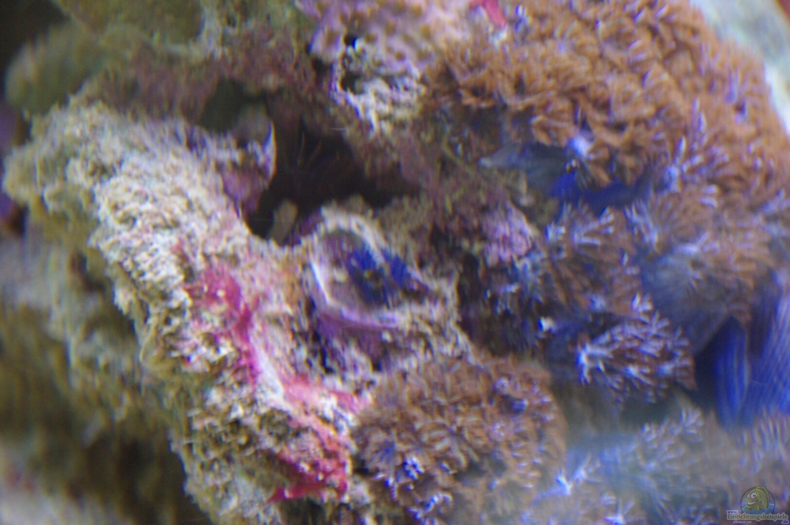 Fische: 3x Amphiprion ocellaris 2x Centropyge loricula 1x Zebrasoma flavescens 4x Sphaeramia nematoptera 4x Chromis viridis 1x Acreichthys tomentosus (zur Bekämpfung der Aiptasia) Wirbellose: div. Schnecken (darunter: Turbo tuberculosus, Cenchritis muricatus, Columbella mercatoria) Einsiedlerkrebse 3x Lysmata amboinensis 2x Lysmata debelius div. Seesterne und Schlangenseesterne div. Krabben (unbestimmt - dürften sich mit Lebendgestein und Korallen eingeschlichen haben) Anemonen: Entacmaea [...]